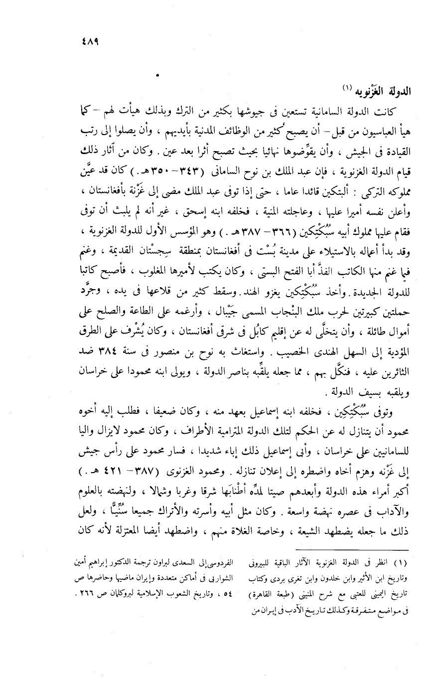 (¬1) انظر فى الدولة الغزنوية الآثار الباقية للبيرونى وتاريخ ابن الأثير وابن خلدون وابن تغرى بردى وكتاب تاريخ اليمينى للعتبى مع شرح المنينى (طبعة القاهرة) فى مواضع متفرقة وكذلك تاريخ الأدب فى إيران من الفردوسى إلى السعدى لبراون ترجمة الدكتور إبراهيم أمين الشواربى فى أماكن متعددة وإيران ماضيها وحاضرها ص 54، وتاريخ الشعوب الإسلامية لبروكلمان ص 266.