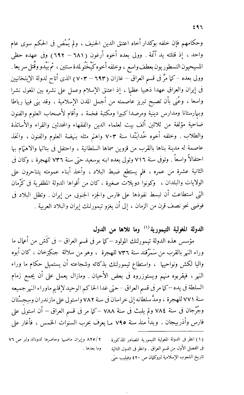 (¬1) انظر فى الدولة المغولية التيمورية المصادر المذكورة فى الفصل الأول من قسم العراق. وانظر فى الدول التالية تاريخ الشعوب الإسلامية لبروكلمان ص 420 وفيليب حتى 2/ 825 وإيران ماضيها وحاضرها لدونالد ولبر ص 76 وما بعدها.