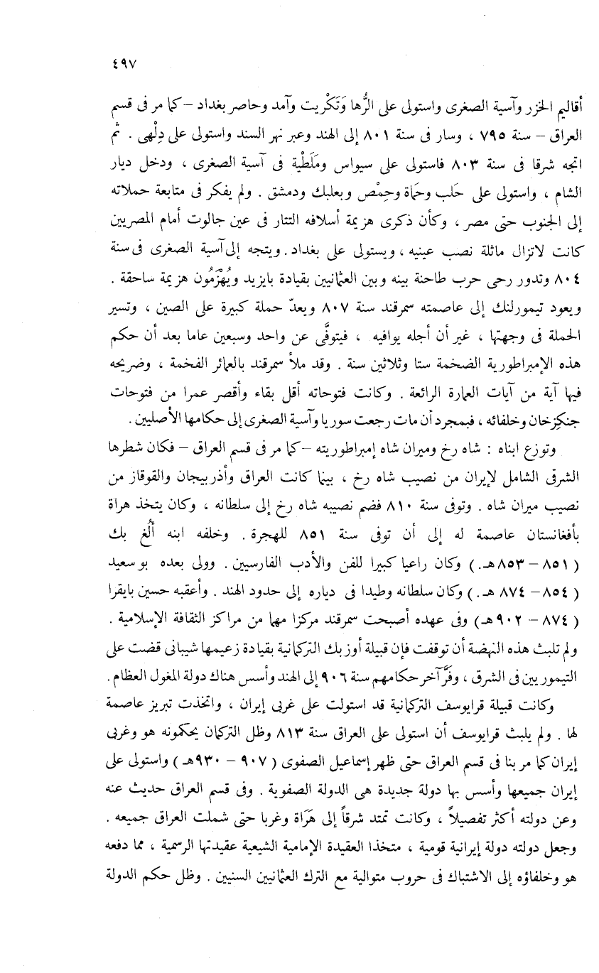 وكانت قبيلة قرايوسف التركمانية قد استولت على غربى إيران، واتخذت تبريز عاصمة لها. ولم يلبث قرايوسف أن استولى على العراق سنة 813 وظل التركمان يحكمونه هو وغربى إيران كما مر بنا فى قسم العراق حتى ظهر إسماعيل الصفوى (907 - 930 هـ) واستولى على إيران جميعها وأسس بها دولة جديدة هى الدولة الصفوية. وفى قسم العراق حديث عنه وعن دولته أكثر تفصيلا، وكانت تمتد شرقا إلى هراة وغربا حتى شملت العراق جميعه.