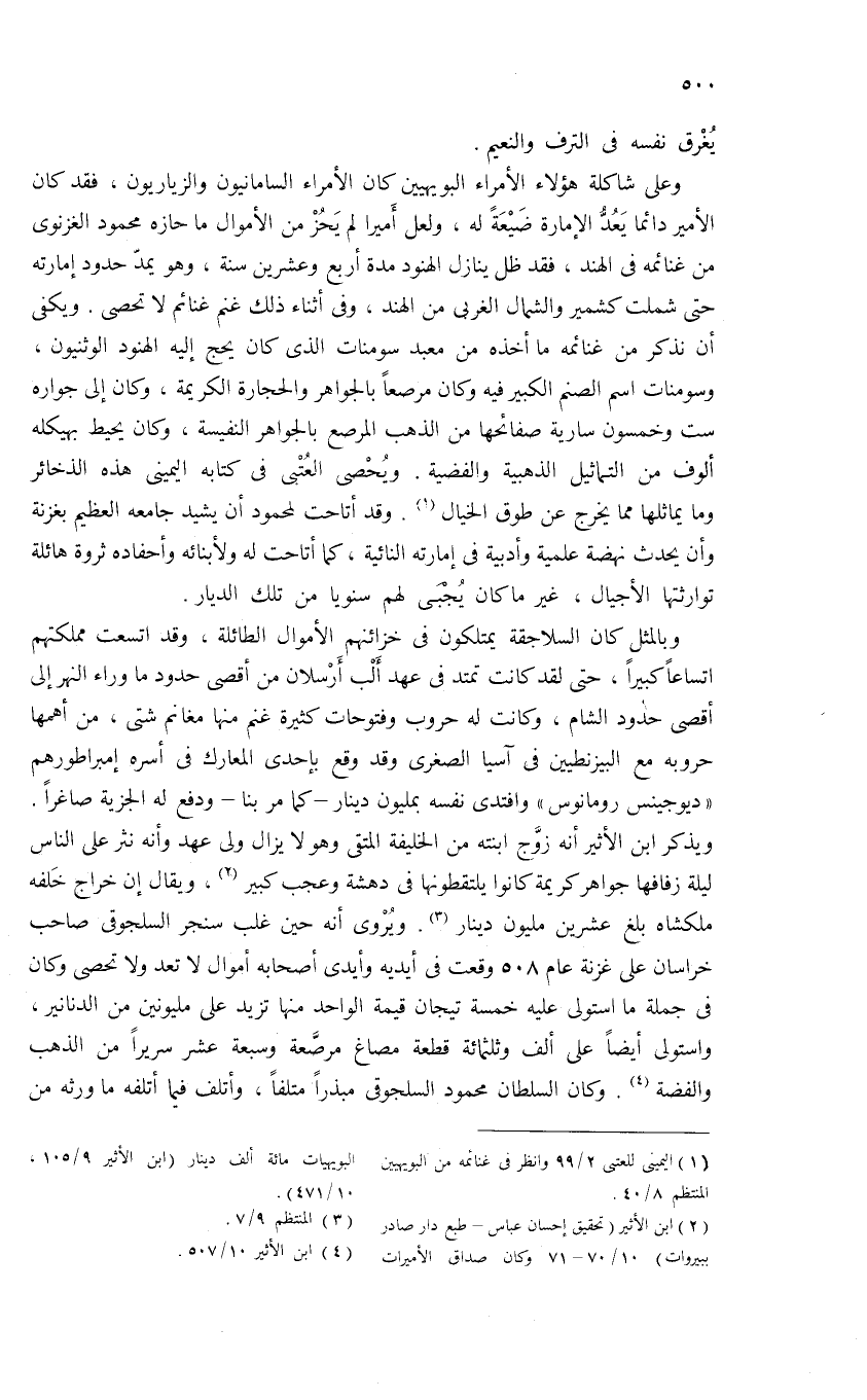 وعلى شاكلة هؤلاء الأمراء البويهيين كان الأمراء السامانيون والزياريون، فقد كان الأمير دائما يعدّ الإمارة ضيعة له، ولعل أميرا لم يحز من الأموال ما حازه محمود الغزنوى من غنائمه فى الهند، فقد ظل ينازل الهنود مدة أربع وعشرين سنة، وهو يمدّ حدود إمارته حتى شملت كشمير والشمال الغربى من الهند، وفى أثناء ذلك غنم غنائم لا تحصى. ويكفى أن نذكر من غنائمه ما أخذه من معبد سومنات الذى كان يحج إليه الهنود الوثنيون، وسومنات اسم الصنم الكبير فيه وكان مرصعا بالجواهر والحجارة الكريمة، وكان إلى جواره ست وخمسون سارية صفائحها من الذهب المرصع بالجواهر النفيسة، وكان يحيط بهيكله ألوف من التماثيل الذهبية والفضية. ويحصى العتبى فى كتابه اليمينى هذه الذخائر وما يماثلها مما يخرج عن طوق الخيال (¬1). وقد أتاحت لمحمود أن يشيد جامعه العظيم بغزنة وأن يحدث نهضة علمية وأدبية فى إمارته النائية، كما أتاحت له ولأبنائه وأحفاده ثروة هائلة توارثتها الأجيال، غير ما كان يجبى لهم سنويا من تلك الديار.