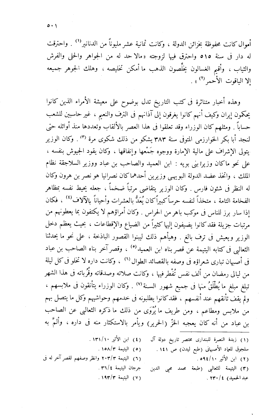 وهذه أخبار متناثرة فى كتب التاريخ تدل بوضوح على معيشة الأمراء الذين كانوا يحكمون إيران وكيف أنهم كانوا يغرقون إلى آذانهم فى الترف والنعيم، غير حاسبين للشعب حسابا. ومثلهم كان الوزراء وقد تعلقوا فى هذا العصر بالألقاب وتعددها منذ أوائله حتى لنجد أبا بكر الخوارزمى المتوفى سنة 383 يشكو من ذلك شكوى مرة (¬3). وكان الوزير يتولى الإشراف على مالية الإمارة ووجوه جمعها وإنفاقها، وكان يقود الجيوش بنفسه، على نحو ما كان وزيرا بنى بويه: ابن العميد والصاحب بن عباد ووزير السلاجقة نظام الملك، واتخذ عضد الدولة البويهى وزيرين أحدهما كان نصرانيا هو نصر بن هرون وكان له النظر فى شئون فارس. وكان الوزير يتقاضى مرتبا ضخما، جعله يحيط نفسه بمظاهر الفخامة التامة، متخذا لنفسه حرسا كبيرا كان يعدّ بالعشرات وأحيانا بالآلاف (¬4)، فكان إذا سار برز للناس فى موكب باهر من الحراس. وكان أمراؤهم لا يكتفون بما يعطونهم من مرتبات جزيلة فقد كانوا يضيفون إليها كثيرا من الضياع والإقطاعات، بحيث يعظم دخل الوزير ويعيش فى ترف بالغ. وهيأهم ذلك ليبنوا القصور الباذخة، على نحو ما يحدثنا الثعالبى فى كتابه اليتيمة عن قصر بناه ابن العميد (¬5)، وقصر آخر بناه الصاحب بن عباد فى أصبهان تبارى شعراؤه فى وصفه بالقصائد الطوال (¬6)، وكانت داره لا تخلو فى كل ليلة من ليالى رمضان من ألف نفس تفطر فيها، وكانت صلاته وصدقاته وقرباته فى هذا الشهر تبلغ مبلغ ما يطلق منها فى جميع شهور السنة (¬7). وكان الوزراء يتأنقون فى ملابسهم، ولم يقف تأنقهم عند أنفسهم، فقد كانوا يطلبونه فى خدمهم وحواشيهم وكل ما يتصل بهم من ملابس ومطاعم، ومن طريف ما يروى من ذلك ما ذكره الثعالبى عن الصاحب بن عباد من أنه كان يعجبه الخزّ (الحرير) ويأمر بالاستكثار منه فى داره، وألمّ به