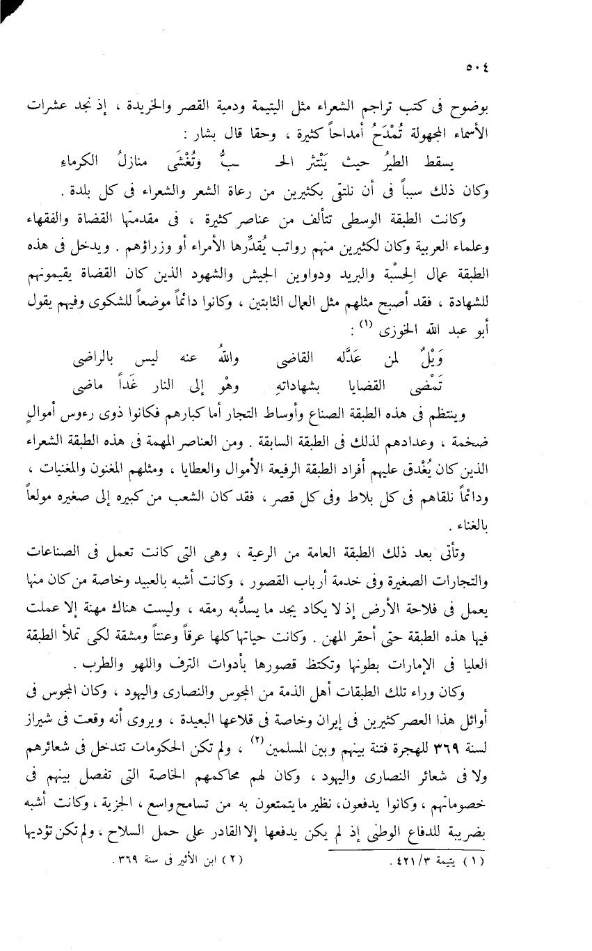 وكان وراء تلك الطبقات أهل الذمة من المجوس والنصارى واليهود، وكان المجوس فى أوائل هذا العصر كثيرين فى إيران وخاصة فى قلاعها البعيدة، ويروى أنه وقعت فى شيراز لسنة 369 للهجرة فتنة بينهم وبين المسلمين (¬2)، ولم تكن الحكومات تتدخل فى شعائرهم ولا فى شعائر النصارى واليهود، وكان لهم محاكمهم الخاصة التى تفصل بينهم فى خصوماتهم، وكانوا يدفعون، نظير ما يتمتعون به من تسامح واسع، الجزية، وكانت أشبه بضريبة للدفاع الوطنى إذ لم يكن يدفعها إلا القادر على حمل السلاح، ولم تكن تؤديها