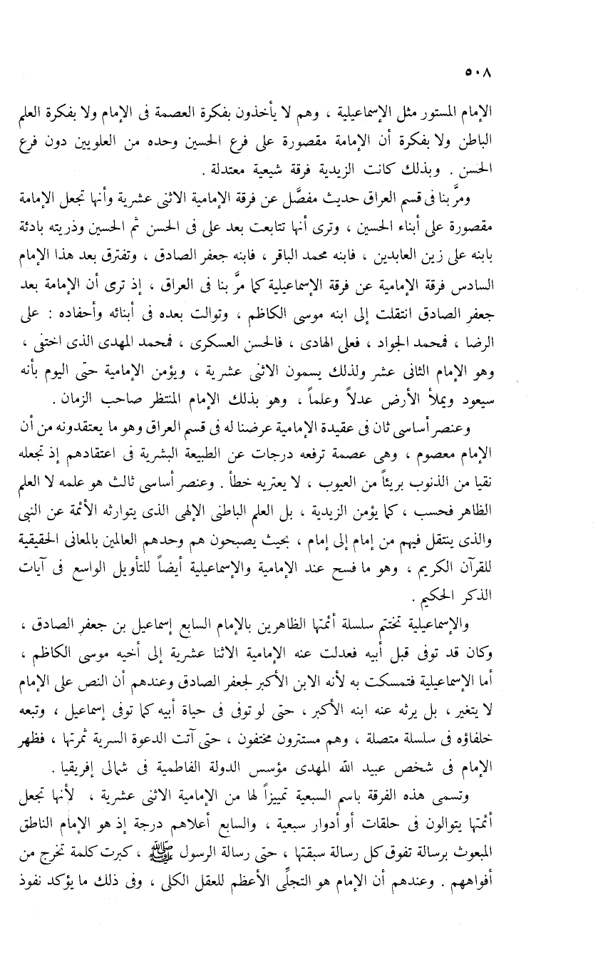 وعنصر أساسى ثان فى عقيدة الإمامية عرضنا له فى قسم العراق وهو ما يعتقدونه من أن الإمام معصوم، وهى عصمة ترفعه درجات عن الطبيعة البشرية فى اعتقادهم إذ تجعله نقيا من الذنوب بريئا من العيوب، لا يعتريه خطأ. وعنصر أساسى ثالث هو علمه لا العلم الظاهر فحسب، كما يؤمن الزيدية، بل العلم الباطنى الإلهى الذى يتوارثه الأئمة عن النبى والذى ينتقل فيهم من إمام إلى إمام، بحيث يصبحون هم وحدهم العالمين بالمعانى الحقيقية للقرآن الكريم، وهو ما فسح عند الإمامية والإسماعيلية أيضا للتأويل الواسع فى آيات الذكر الحكيم.