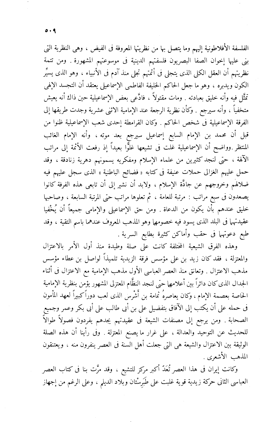 الفلسفة الأفلاطونية إليهم وما يتصل بها من نظريتها المعروفة فى الفيض، وهى النظرية التى بنى عليها إخوان الصفا البصريون فلسفتهم الدينية فى موسوعتهم المشهورة. ومن تتمة نظريتهم أن العقل الكلى الذى يتجلى فى أئمتهم تجلى منذ آدم فى الأنبياء، وهو الذى يسيّر الكون ويدبره، وهو ما جعل الحاكم الخليفة الفاطمى الإسماعيلى يعتقد أن التجسد الإلهى تمثّل فيه وأنه خليق بعبادته. ومات مقتولا، فادّعى بعض الإسماعيلية حين ذاك أنه يعيش متخفيا، وأنه سيرجع. وكأن نظرية الرجعة عند الإمامية الاثنى عشرية وجدت طريقها إلى الفرقة الإسماعيلية فى شخص الحاكم. وكان القرامطة إحدى شعب الإسماعيلية ظنوا من قبل أن محمد بن الإمام السابع إسماعيل سيرجع بعد موته، وأنه الإمام الغائب المنتظر. وواضح أن الإسماعيلية غلت فى تشيعها غلوّا بعيدا إذ رفعت الأئمة إلى مراتب الآلهة، حتى لنجد كثيرين من علماء الإسلام ومفكريه يسمونهم دهرية زنادقة، وقد حمل عليهم الغزالى حملات عنيفة فى كتابه «فضائح الباطنية» الذى سجل عليهم فيه ضلالهم وخروجهم عن جادّة الإسلام، ولابد أن نشير إلى أن تابعى هذه الفرقة كانوا يصعدون فى سبع مراتب: مرتبة للعامة، ثم تعلوها مراتب حتى المرتبة السابعة، وصاحبها خليق عندهم بأن يكون من الدعاة. ومن حق الإسماعيلى والإمامى جميعا أن يخفيا عقيدتهما فى البلد الذى يسود فيه خصومهما وهو المذهب المعروف عندهما باسم التقية، وقد طبع دعوتهما فى حقب وأماكن كثيرة بطابع السرية.