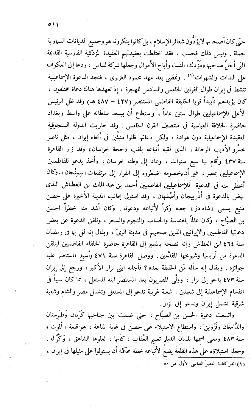 حتى كان أصحابها لا يؤدّون شعائر الإسلام، بل كانوا ينكرونه هو وجميع الديانات السماوية جملة. وليس ذلك فحسب، فقد اختلطت بعقيدتهم العقيدة المزدكية الفارسية القديمة التى أحلّ صاحبها «مزدك» النساء وأباح الأموال وجعلها شركة للناس، ودعا إلى العكوف على اللذات والشهوات (¬1). ونمضى بعد عهد محمود الغزنوى، فنجد الدعوة الإسماعيلية تنشط فى إيران طوال القرنين الخامس والسادس للهجرة، إذ تعهدها هناك دعاة مختلفون، كان يؤيدهم تأييدا قويا الخليفة الفاطمى المستنصر (427 - 487 هـ) وقد ظل الرئيس الأعلى للإسماعيليين طوال ستين عاما، واستطاع أن يبسط سلطانه على واسط وبغداد حاضرة الخلافة العباسية فى منتصف القرن الخامس. وقد حاربت الدولة السلجوقية العقيدة الإسماعيلية دون هوادة، ولكن دعاتها ظلوا منبثّين فى أنحاء إيران، مثل ناصر خسرو الأديب الرحالة، الذى لقبه أتباعه بلقب «حجة خراسان» وقد زار القاهرة سنة 437 وأقام بها سبع سنوات، وعاد إلى وطنه خراسان، وأخذ يدعو للفاطميين الإسماعيليين بمصر، غير أن خصومه اضطروه إلى الفرار إلى مرتفعات «سمنجان». وكان أخطر منه فى الدعوة للإسماعيليين الفاطميين أحمد بن عبد الملك بن العطاش الذى نهض بالدعوة فى أذربيجان وأصفهان، وقد استولى بجانب المدينة الأخيرة على حصن منيع يسمى «شاه دز» جعله وكرا لأتباعه ودعوته. وكان أشد منه خطرا الحسن بن الصبّاح، وكان عالما بالهندسة والحساب والنجوم والسحر، وتلقن الدعوة عن بعض دعاتها الفاطميين والإيرانيين الذين صحبهم فى مدينة الرىّ، ويقال إنه لقى بها فى رمضان سنة 464 ابن العطاش وإنه نصحه بالمسير إلى القاهرة حاضرة الخلفاء الفاطميين ليتلقن الدعوة من أربابها وشيوخها المقدّمين. ووصل القاهرة سنة 471 وأسبغ المستنصر عليه جوائزه. ويقال إنه سأله من الخليفة بعده؟ فأجابه ابنى نزار الأكبر، ورجع إلى إيران سنة 473 يدعو إلى نزار، وولّى المصريون بعد المستنصر ابنه المستعلى، مما كان سببا فى انقسام الإسماعيلية إلى شعبتين: شعبة غريبة تدعو إلى المستعلى وتشمل مصر والشام وشعبة شرقية تشمل إيران وتدعو إلى نزار.