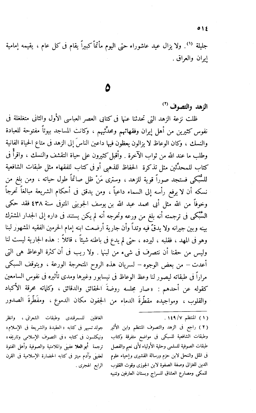 (¬2) راجع فى الزهد والتصوف المنتظم وابن الأثير وطبقات الشافعية للسبكى فى مواضع متفرقة وكتاب طبقات الصوفية للسلمى وحلية الأولياء لأبى نعيم والفصل فى الملل والنحل لابن حزم ورسالة القشيرى وإحياء علوم الدين للغزالى وصفة الصفوة لابن الجوزى وقوت القلوب للمكى ومصارع العشاق للسراج وبستان العارفين وتنبيه الغافلين للسمرقندى وطبقات الشعرانى، وانظر جولد تسيهر فى كتابه «العقيدة والشريعة فى الإسلام» ونيكلسون فى كتابه «فى التصوف الإسلامى وتاريخه» ترجمة أبو العلا عفيفى والملامتية والصوفية وأهل الفتوة لعفيفى وآدم مينز فى كتابه الحضارة الإسلامية فى القرن الرابع الهجرى.