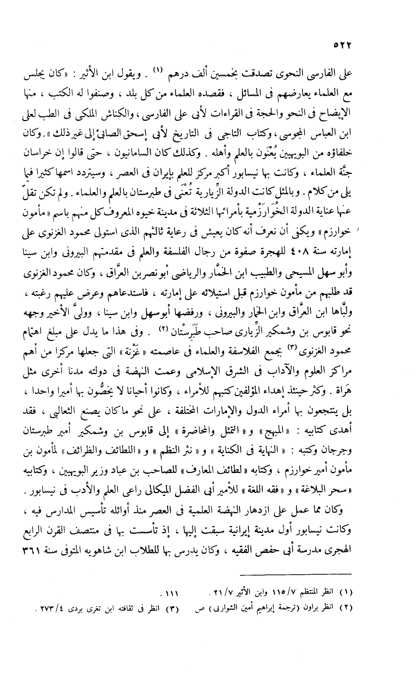 على الفارسى النحوى تصدقت بخمسين ألف درهم (¬1). ويقول ابن الأثير: «كان يجلس مع العلماء يعارضهم فى المسائل، فقصده العلماء من كل بلد، وصنفوا له الكتب، منها الإيضاح فى النحو والحجة فى القراءات لأبى على الفارسى، والكناش الملكى فى الطب لعلى ابن العباس المجوسى، وكتاب التاجى فى التاريخ لأبى إسحق الصابئ إلى غير ذلك». وكان خلفاؤه من البويهيين يعنون بالعلم وأهله. وكذلك كان السامانيون، حتى قالوا إن خراسان جنّة العلماء، وكانت بها نيسابور أكبر مركز للعلم بإيران فى العصر، وسيتردد اسمها كثيرا فيما يلى من كلام. وبالمثل كانت الدولة الزّيارية تعنى فى طبرستان بالعلم والعلماء. ولم تكن تقلّ عنها عناية الدولة الخوارزمية بأمرائها الثلاثة فى مدينة خيوه المعروف كل منهم باسم «مأمون خوارزم» ويكفى أن نعرف أنه كان يعيش فى رعاية ثالثهم الذى استولى محمود الغزنوى على إمارته سنة 408 للهجرة صفوة من رجال الفلسفة والعلم فى مقدمتهم البيرونى وابن سينا وأبو سهل المسيحى والطبيب ابن الخمّار والرياضى أبو نصر بن العرّاق، وكان محمود الغزنوى قد طلبهم من مأمون خوارزم قبل استيلائه على إمارته، فاستدعاهم وعرض عليهم رغبته، ولبّاها ابن العرّاق وابن الخمار والبيرونى، ورفضها أبو سهل وابن سينا، وولىّ الأخير وجهه نحو قابوس بن وشمكير الزّيارى صاحب طبرستان (¬2). وفى هذا ما يدل على مبلغ اهتمام محمود الغزنوى (¬3) بجمع الفلاسفة والعلماء فى عاصمته «غزنة» التى جعلها مركزا من أهم مراكز العلوم والآداب فى الشرق الإسلامى وعمت النهضة فى دولته مدنا أخرى مثل هراة. وكثر حينئذ إهداء المؤلفين كتبهم للأمراء، وكانوا أحيانا لا يخصّون بها أميرا واحدا، بل ينتجعون بها أمراء الدول والإمارات المختلفة، على نحو ما كان يصنع الثعالبى، فقد أهدى كتابيه: «المبهج» و «التمثل والمحاضرة» إلى قابوس بن وشمكير أمير طبرستان وجرجان وكتبه: «النهاية فى الكناية» و «نثر النظم» و «اللطائف والظرائف» لمأمون بن مأمون أمير خوارزم، وكتابه «لطائف المعارف» للصاحب بن عباد وزير البويهيين، وكتابيه «سحر البلاغة» و «فقه اللغة» للأمير أبى الفضل الميكالى راعى العلم والأدب فى نيسابور.
