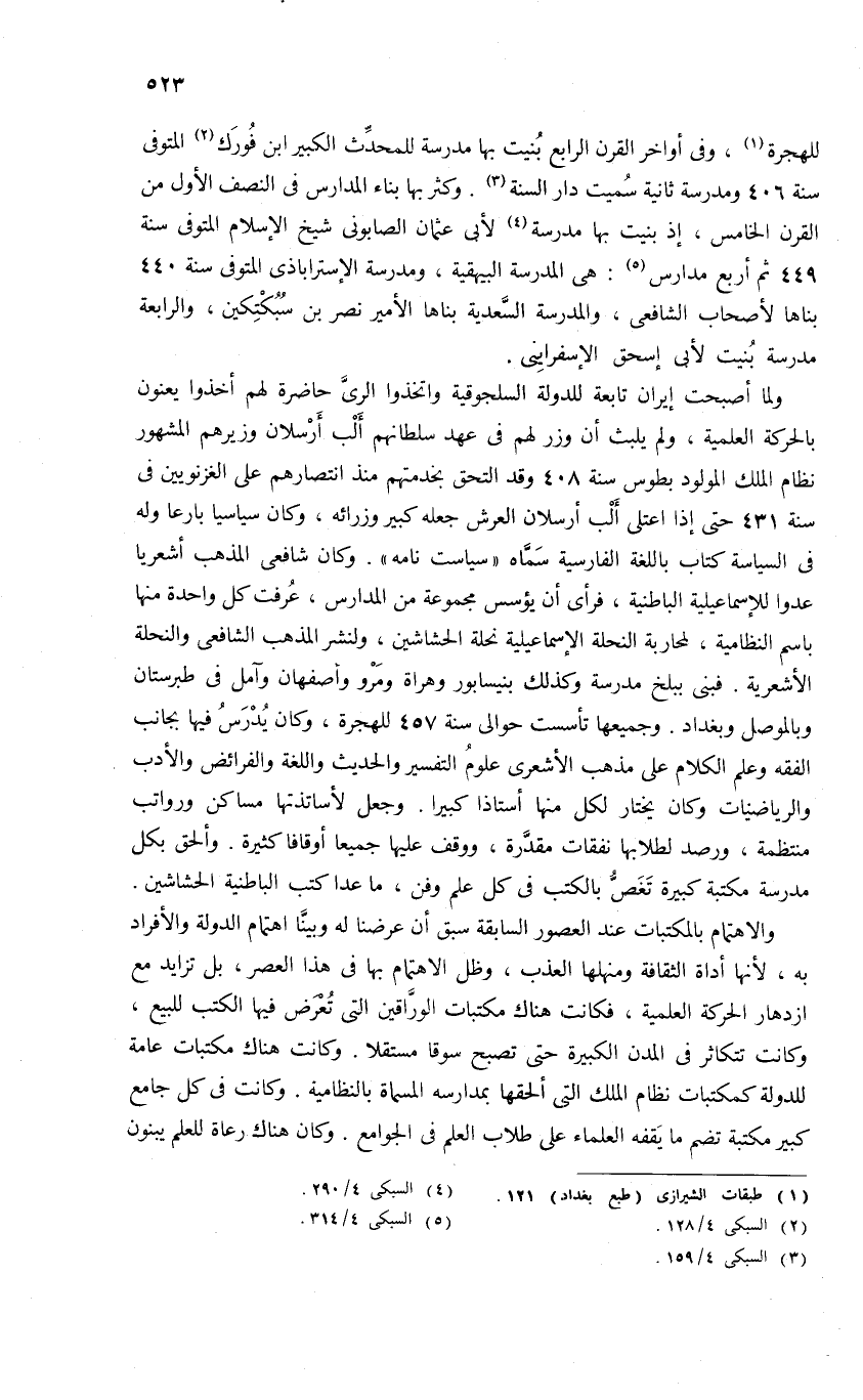 ولما أصبحت إيران تابعة للدولة السلجوقية واتخذوا الرىّ حاضرة لهم أخذوا يعنون بالحركة العلمية، ولم يلبث أن وزر لهم فى عهد سلطانهم ألب أرسلان وزيرهم المشهور نظام الملك المولود بطوس سنة 408 وقد التحق بخدمتهم منذ انتصارهم على الغزنويين فى سنة 431 حتى إذا اعتلى ألب أرسلان العرش جعله كبير وزرائه، وكان سياسيا بارعا وله فى السياسة كتاب باللغة الفارسية سمّاه «سياست نامه». وكان شافعى المذهب أشعريا عدوا للإسماعيلية الباطنية، فرأى أن يؤسس مجموعة من المدارس، عرفت كل واحدة منها باسم النظامية، لمحاربة النحلة الإسماعيلية نحلة الحشاشين، ولنشر المذهب الشافعى والنحلة الأشعرية. فبنى ببلخ مدرسة وكذلك بنيسابور وهراة ومرو وأصفهان وآمل فى طبرستان وبالموصل وبغداد. وجميعها تأسست حوالى سنة 457 للهجرة، وكان يدرس فيها بجانب الفقه وعلم الكلام على مذهب الأشعرى علوم التفسير والحديث واللغة والفرائض والأدب والرياضيات وكان يختار لكل منها أستاذا كبيرا. وجعل لأساتذتها مساكن ورواتب منتظمة، ورصد لطلابها نفقات مقدّرة، ووقف عليها جميعا أوقافا كثيرة. وألحق بكل مدرسة مكتبة كبيرة تغصّ بالكتب فى كل علم وفن، ما عدا كتب الباطنية الحشاشين.