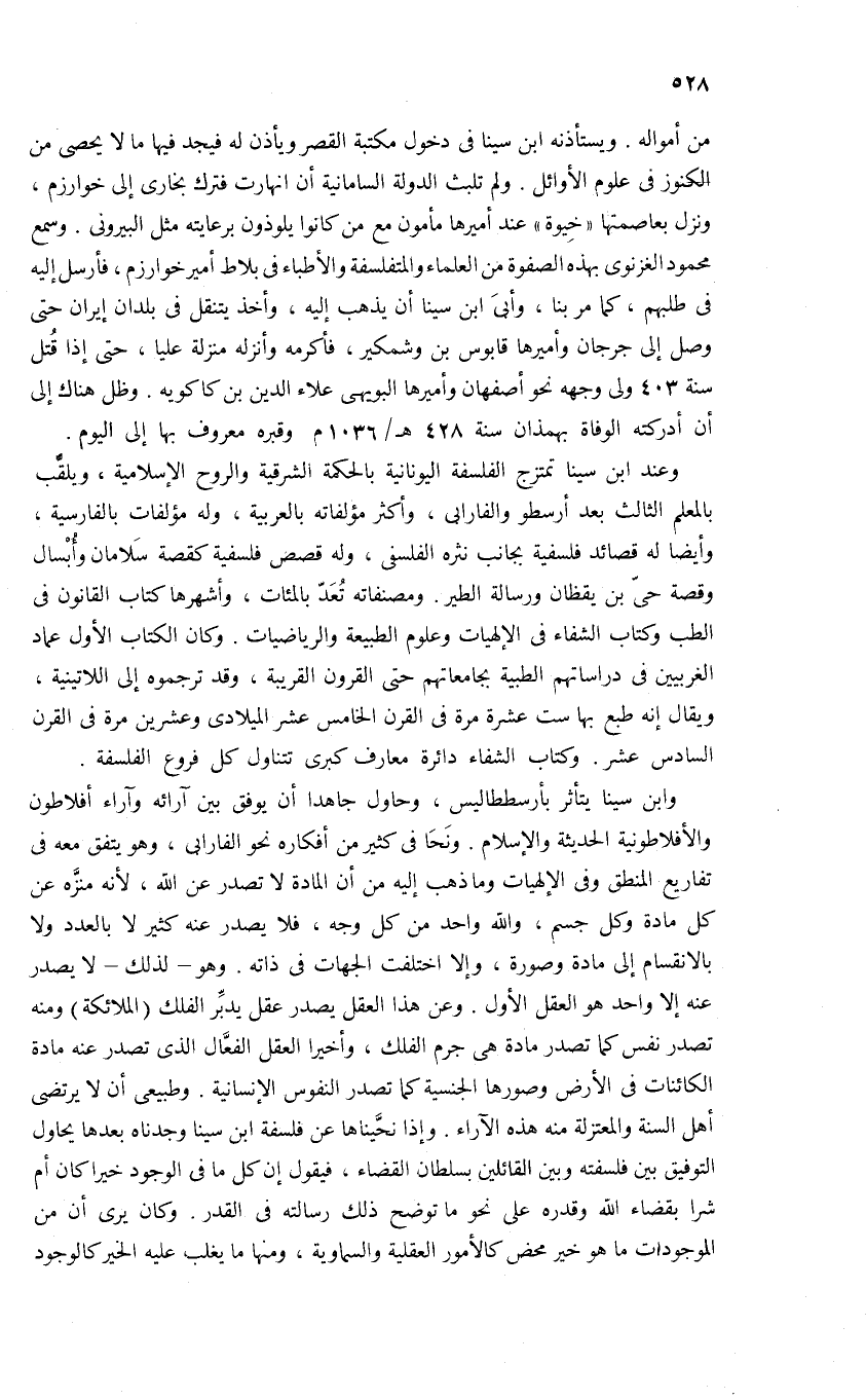 من أمواله. ويستأذنه ابن سينا فى دخول مكتبة القصر ويأذن له فيجد فيها ما لا يحصى من الكنوز فى علوم الأوائل. ولم تلبث الدولة السامانية أن انهارت فترك بخارى إلى خوارزم، ونزل بعاصمتها «خيوة» عند أميرها مأمون مع من كانوا يلوذون برعايته مثل البيرونى. وسمع محمود الغزنوى بهذه الصفوة من العلماء والمتفلسفة والأطباء فى بلاط أمير خوارزم، فأرسل إليه فى طلبهم، كما مر بنا، وأبى ابن سينا أن يذهب إليه، وأخذ يتنقل فى بلدان إيران حتى وصل إلى جرجان وأميرها قابوس بن وشمكير، فأكرمه وأنزله منزلة عليا، حتى إذا قتل سنة 403 ولى وجهه نحو أصفهان وأميرها البويهى علاء الدين بن كاكويه. وظل هناك إلى أن أدركته الوفاة بهمذان سنة 428 هـ/1036 م وقبره معروف بها إلى اليوم.