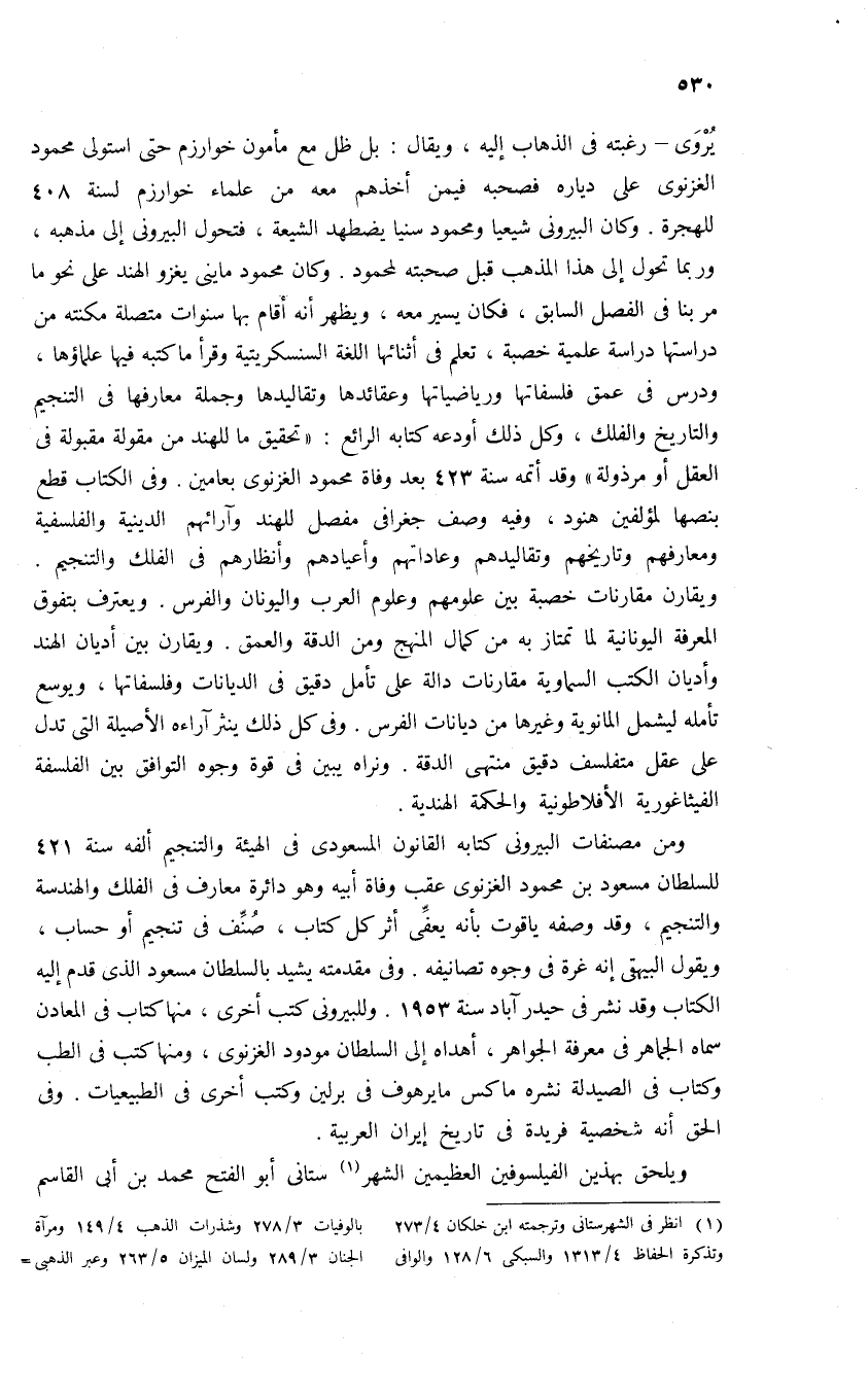 يروى-رغبته فى الذهاب إليه، ويقال: بل ظل مع مأمون خوارزم حتى استولى محمود الغزنوى على دياره فصحبه فيمن أخذهم معه من علماء خوارزم لسنة 408 للهجرة. وكان البيرونى شيعيا ومحمود سنيا يضطهد الشيعة، فتحول البيرونى إلى مذهبه، وربما تحول إلى هذا المذهب قبل صحبته لمحمود. وكان محمود ماينى يغزو الهند على نحو ما مر بنا فى الفصل السابق، فكان يسير معه، ويظهر أنه أقام بها سنوات متصلة مكنته من دراستها دراسة علمية خصبة، تعلم فى أثنائها اللغة السنسكريتية وقرأ ما كتبه فيها علماؤها، ودرس فى عمق فلسفاتها ورياضياتها وعقائدها وتقاليدها وجملة معارفها فى التنجيم والتاريخ والفلك، وكل ذلك أودعه كتابه الرائع: «تحقيق ما للهند من مقولة مقبولة فى العقل أو مرذولة» وقد أتمه سنة 423 بعد وفاة محمود الغزنوى بعامين. وفى الكتاب قطع بنصها لمؤلفين هنود، وفيه وصف جغرافى مفصل للهند وآرائهم الدينية والفلسفية ومعارفهم وتاريخهم وتقاليدهم وعاداتهم وأعيادهم وأنظارهم فى الفلك والتنجيم.