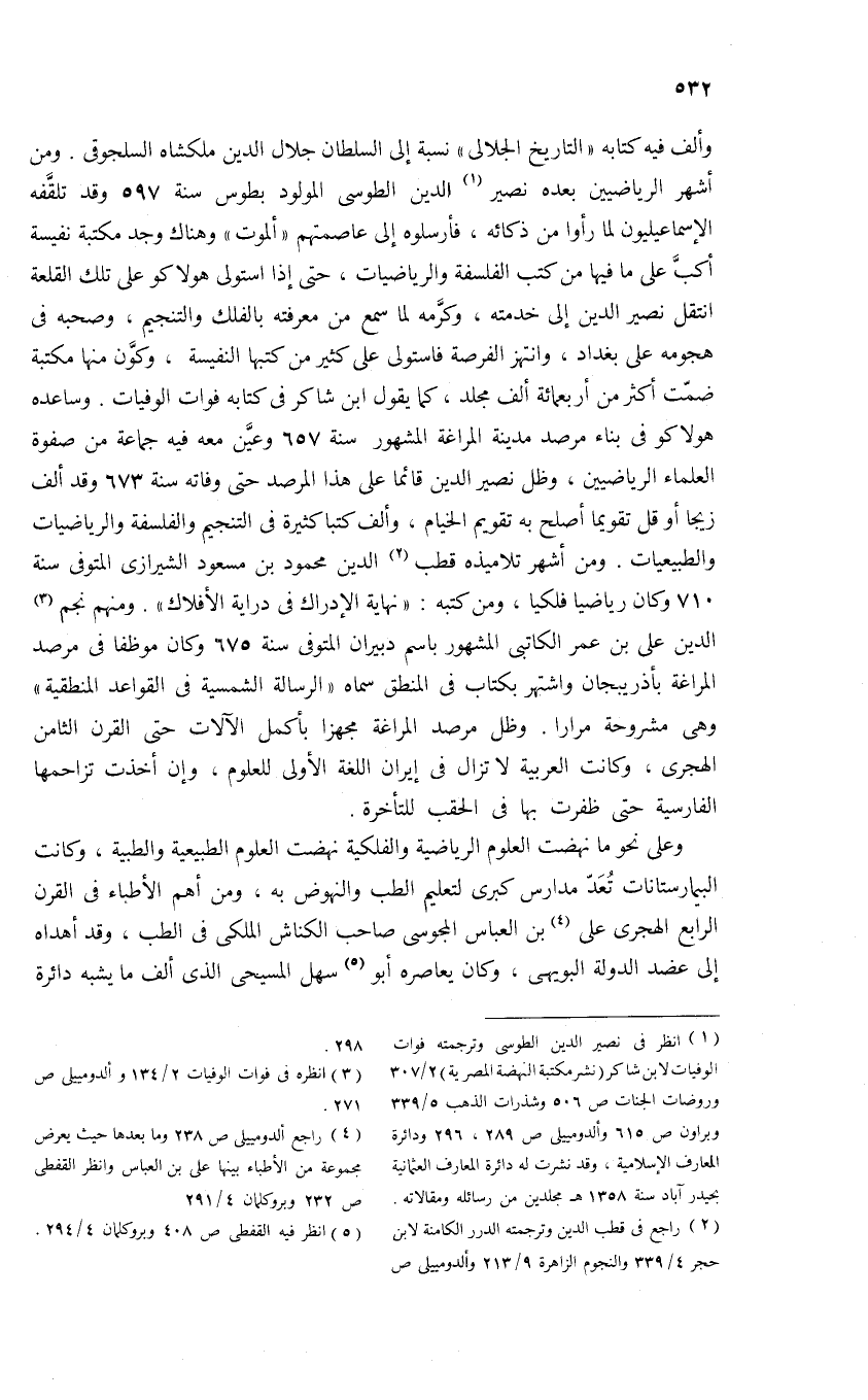 (¬1) انظر فى نصير الدين الطوسى وترجمته فوات الوفيات لابن شاكر (نشر مكتبة النهضة المصرية) 2/ 307 وروضات الجنات ص 506 وشذرات الذهب 5/ 339 وبراون ص 615 وألدومييلى ص 289، 296 ودائرة المعارف الإسلامية، وقد نشرت له دائرة المعارف العثمانية بحيدر آباد سنة 1358 هـ مجلدين من رسائله ومقالاته.