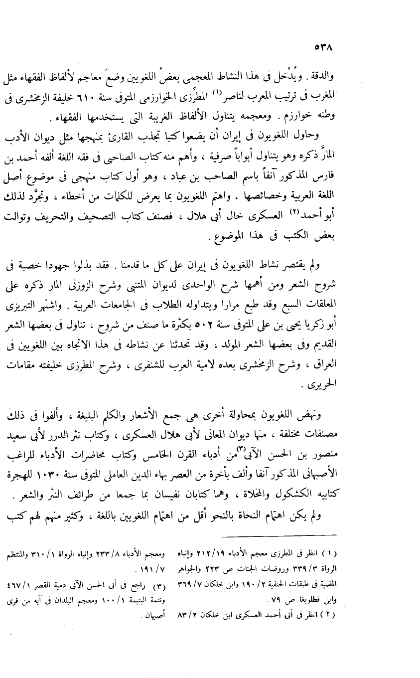 وحاول اللغويون فى إيران أن يضعوا كتبا تجذب القارئ بمنهجها مثل ديوان الأدب المارّ ذكره وهو يتناول أبوابا صرفية، وأهم منه كتاب الصاحبى فى فقه اللغة ألفه أحمد بن فارس المذكور آنفا باسم الصاحب بن عباد، وهو أول كتاب منهجى فى موضوع أصل اللغة العربية وخصائصها. واهتم اللغويون بما يعرض للكلمات من أخطاء، وتجرّد لذلك أبو أحمد (¬2) العسكرى خال أبى هلال، فصنف كتاب التصحيف والتحريف وتوالت بعض الكتب فى هذا الموضوع.
