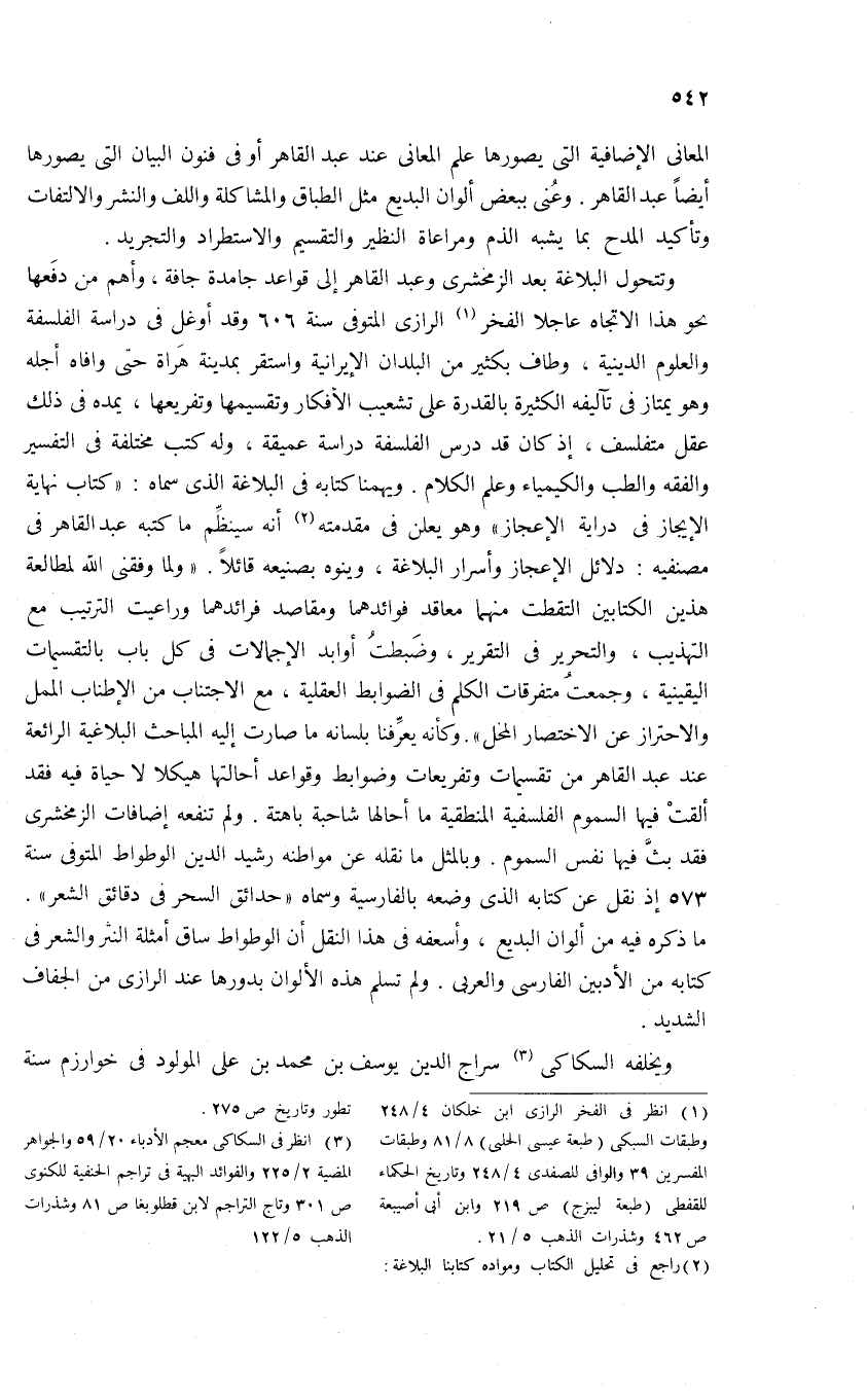 وتتحول البلاغة بعد الزمخشرى وعبد القاهر إلى قواعد جامدة جافة، وأهم من دفعها نحو هذا الاتجاه عاجلا الفخر (¬1) الرازى المتوفى سنة 606 وقد أوغل فى دراسة الفلسفة والعلوم الدينية، وطاف بكثير من البلدان الإيرانية واستقر بمدينة هراة حتى وافاه أجله وهو يمتاز فى تآليفه الكثيرة بالقدرة على تشعيب الأفكار وتقسيمها وتفريعها، يمده فى ذلك عقل متفلسف، إذ كان قد درس الفلسفة دراسة عميقة، وله كتب مختلفة فى التفسير والفقه والطب والكيمياء وعلم الكلام. ويهمنا كتابه فى البلاغة الذى سماه: «كتاب نهاية الإيجاز فى دراية الإعجاز» وهو يعلن فى مقدمته (¬2) أنه سينظّم ما كتبه عبد القاهر فى مصنفيه: دلائل الإعجاز وأسرار البلاغة، وينوه بصنيعه قائلا. «ولما وفقنى الله لمطالعة هذين الكتابين التقطت منهما معاقد فوائدهما ومقاصد فرائدهما وراعيت الترتيب مع التهذيب، والتحرير فى التقرير، وضبطت أوابد الإجمالات فى كل باب بالتقسيمات اليقينية، وجمعت متفرقات الكلم فى الضوابط العقلية، مع الاجتناب من الإطناب الممل والاحتراز عن الاختصار المخل». وكأنه يعرّفنا بلسانه ما صارت إليه المباحث البلاغية الرائعة عند عبد القاهر من تقسيمات وتفريعات وضوابط وقواعد أحالتها هيكلا لا حياة فيه فقد ألقت فيها السموم الفلسفية المنطقية ما أحالها شاحبة باهتة. ولم تنفعه إضافات الزمخشرى فقد بثّ فيها نفس السموم. وبالمثل ما نقله عن مواطنه رشيد الدين الوطواط المتوفى سنة 573 إذ نقل عن كتابه الذى وضعه بالفارسية وسماه «حدائق السحر فى دقائق الشعر».