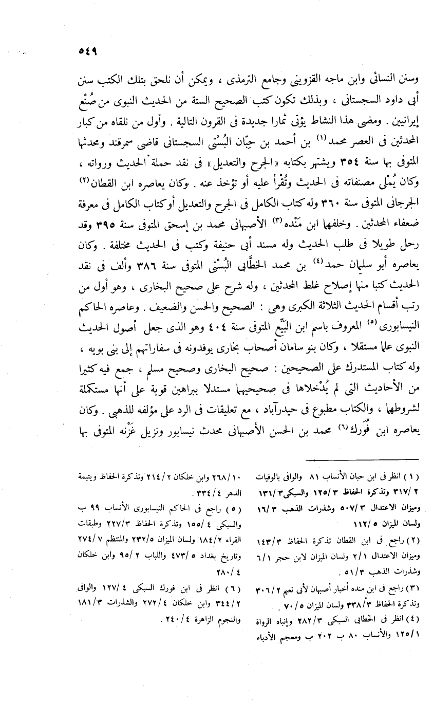 وسنن النسائى وابن ماجه القزوينى وجامع الترمذى، ويمكن أن نلحق بتلك الكتب سنن أبى داود السجستانى، وبذلك تكون كتب الصحيح الستة من الحديث النبوى من صنع إيرانيين. ومضى هذا النشاط يؤتى ثمارا جديدة فى القرون التالية. وأول من نلقاه من كبار المحدثين فى العصر محمد (¬1) بن أحمد بن حبّان البستى السجستانى قاضى سمرقند ومحدثها المتوفى بها سنة 354 ويشتهر بكتابه «الجرح والتعديل» فى نقد حملة الحديث ورواته، وكان يملى مصنفاته فى الحديث وتقرأ عليه أو تؤخذ عنه. وكان يعاصره ابن القطان (¬2) الجرجانى المتوفى سنة 360 وله كتاب الكامل فى الجرح والتعديل أو كتاب الكامل فى معرفة ضعفاء المحدثين. وخلفهما ابن منده (¬3) الأصبهانى محمد بن إسحق المتوفى سنة 395 وقد رحل طويلا فى طلب الحديث وله مسند أبى حنيفة وكتب فى الحديث مختلفة. وكان يعاصره أبو سليمان حمد (¬4) بن محمد الخطّابى البستى المتوفى سنة 386 وألف فى نقد الحديث كتبا منها إصلاح غلط المحدثين، وله شرح على صحيح البخارى، وهو أول من رتب أقسام الحديث الثلاثة الكبرى وهى: الصحيح والحسن والضعيف. وعاصره الحاكم النيسابورى (¬5) المعروف باسم ابن البيّع المتوفى سنة 404 وهو الذى جعل أصول الحديث النبوى علما مستقلا، وكان بنو سامان أصحاب بخارى يوفدونه فى سفاراتهم إلى بنى بويه، وله كتاب المستدرك على الصحيحين: صحيح البخارى وصحيح مسلم، جمع فيه كثيرا من الأحاديث التى لم يدخلاها فى صحيحيهما مستدلا ببراهين قوية على أنها مستكملة لشروطهما، والكتاب مطبوع فى حيدر آباد، مع تعليقات فى الرد على مؤلفه للذهبى. وكان يعاصره ابن فورك (¬6) محمد بن الحسن الأصبهانى محدث نيسابور ونزيل غزنه المتوفى بها