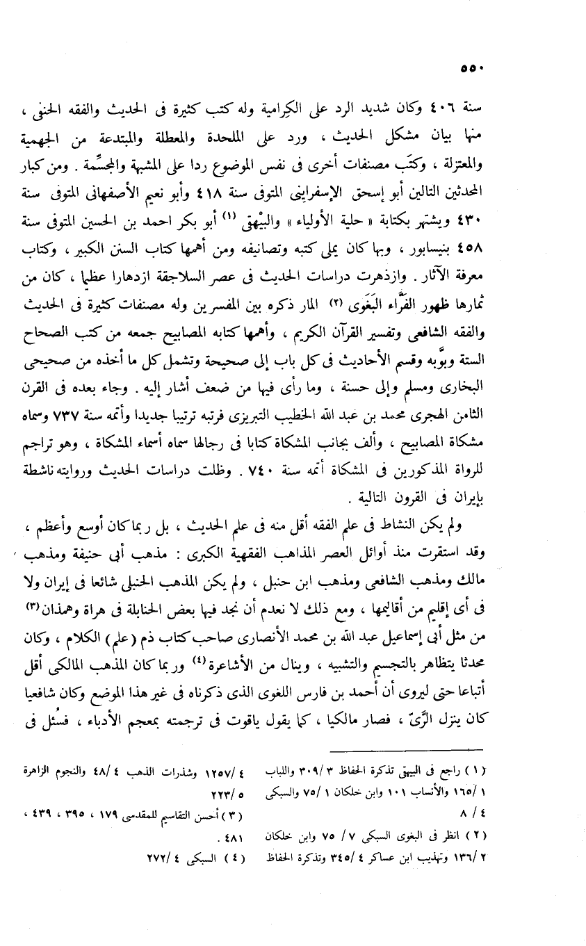 سنة 406 وكان شديد الرد على الكرامية وله كتب كثيرة فى الحديث والفقه الحنفى، منها بيان مشكل الحديث، ورد على الملحدة والمعطلة والمبتدعة من الجهمية والمعتزلة، وكتب مصنفات أخرى فى نفس الموضوع ردا على المشبهة والمجسّمة. ومن كبار المحدثين التالين أبو إسحق الإسفراينى المتوفى سنة 418 وأبو نعيم الأصفهانى المتوفى سنة 430 ويشتهر بكتابة «حلى الأولياء» والبيهقى (¬1) أبوبكر احمد بن الحسين المتوفى سنة 458 نيسابور، وبها كان يملى كتبه وتصانيفه ومن أهمها كتاب السنن الكبير، وكتاب معرفة الآثار. وازذهرت دراسات الحديث فى عصر السلاجقة ازدهارا عظيما، كان من ثمارها ظهور الفرّاء البغوى (¬2) المار ذكره بين المفسرين وله مصنفات كثيرة فى الحديث والفقه الشافعى وتفسير القرآن الكريم، وأهمها كتابه المصابيح جمعه من كتب الصحاح الستة وبوّبه وقسم الأحاديث فى كل باب إلى صحيحة وتشمل كل ما أخذه من صحيحى البخارى ومسلم وإلى حسنة، وما رأى فيها من ضعف أشار إليه. وجاء بعده فى القرن الثامن الهجرى محمد بن عبد الله الخطيب التبريزى فرتبه ترتيبا جديدا وأتمه سنة 737 وسماه مشكاة المصابيح، وألف بجانب المشكاة كتابا فى رجالها سماه أسماء المشكاة، وهو تراجم للرواة المذكورين فى المشكاة أتمه سنة 740. وظلت دراسات الحديث وروايته ناشطة بإيران فى القرون التالية.