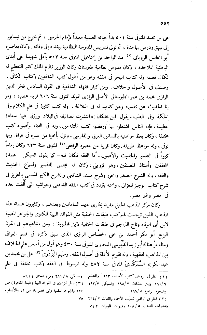 على بن محمد المتوفى سنة 504 بدأ حياته العلمية معيدا لإمام الحرمين، ثم خرج من نيسابور إلى بيهق ودرس بها مدة، ثم تولى تدريس المدرسة النظامية ببغداد إلى وفاته. وكان يعاصره أبو المحاسن الرويانى (¬1) عبد الواحد بن إسماعيل المتوفى سنة 502 بآمل شهيدا على أيدى الباطنية الملاحدة، وكان مدرس نظامية طبرستان وكان الوزير نظام الملك كثير التعظيم له لكمال فضله وله كتاب البحر فى الفقه وهو من أطول كتب الشافعيين وكتاب الكافى، وصنف فى الأصول والخلاف. ومن كبار فقهاء الشافعية فى القرن السادس فخر الدين الرازى محمد بن عمر الطبرستانى الأصل الرازى المولد المتوفى سنة 606 فريد عصره، ومر بنا الحديث عن تفسيره وعن كتاب له فى البلاغة، وله كتب كثيرة فى علم الكلام وفى الحكمة وفى الطب، يقول ابن خلكان: «انتشرت تصانيفه فى البلاد ورزق فيها سعادة عظيمة، فإن الناس اشتغلوا بها ورفضوا كتب المتقدمين، وله فى الفقه وأصوله كتب مختلفة، وكان يعظ مواطنيه باللسانين العربى والفارسى، ونزل بأخرة من عمره فى هراة. وبها توفى، وله مواعظ طريفة. وكان قريبا من عصره الرافعى (¬2) المتوفى سنة 623 وكان إماما كبيرا فى التفسير والحديث والأصول، أما الفقه فكان فيه-كما يقول السبكى-عمدة المحققين وأستاذ المصنفين، وهو قزوينى، وكان له مجلس للتفسير ولسماع الحديث والفقه، وله الشرح الصغير والمحرر وشرح مسند الشافعى والشرح الكبير المسمى بالعزيز فى شرح كتاب الوجيز للغزالى، واسمه يتردد فى كتب الفقه الشافعى وحواشيه التى ألّفت بعده فى مصر وغير مصر.