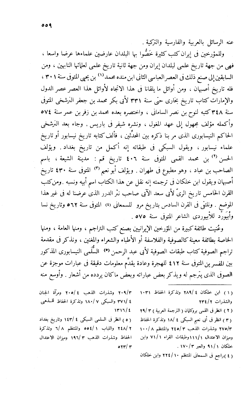 وعنيت طائفة كبيرة من المؤرخين الإيرانيين بصنع كتب التراجم، ومنها العامة، ومنها الخاصة بطائفة معينة كالصوفية والفلاسفة أو الأطباء والشعراء والمغنين، ونذكر فى مقدمة تراجم الصوفية كتاب طبقات الصوفية لأبى عبد الرحمن (¬5) السّلمى النيسابورى المذكور بين المفسرين المتوفى سنة 412 للهجرة وعادة يقدّم معلومات دقيقة فى عبارات موجزة عن الصوفى الذى يترجم له ويذكر بعض عباراته وبعض ما كان يردده من أشعار. وأوسع منه