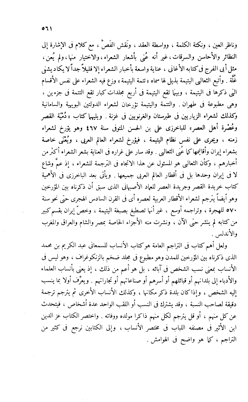 وناظر العين، ونكتة الكلمة، وواسطة العقد، ونقش الفصّ، مع كلام فى الإشارة إلى النظائر والأحاسن والسرقات، غير أنه عنى بأشعار الشعراء، والاختيار منها، ولم يعن، مثل أبى الفرج فى كتابه الأغانى، عناية واسعة بأخبار الشعراء إلا قليلا جدا لا يكاد يشفى غلّة. وأتبع الثعالبى اليتيمة بذيل لها سماه «تتمة اليتيمة» وزع فيه الشعراء على نفس الأقسام التى ذكرها فى اليتيمة، وبينما تقع اليتيمة فى أربع مجلدات كبار تقع التتمة فى جزءين، وهى مطبوعة فى طهران. والتتمة واليتيمة تؤرخان لشعراء الدولتين البويهية والسامانية وكذلك لشعراء الزياريين فى طبرستان والغزنويين فى غزنة. ويليهما كتاب «دمية القصر وعصرة أهل العصر» للباخرزى على بن الحسن المتوفى سنة 467 وهو يؤرخ لشعراء زمنه، ويجرى على نفس نظام اليتيمة، فيؤرخ لشعراء العالم العربى، ويعنى خاصة بشعراء إيران وأقاليمها كما عنى الثعالبى. وقد سار على غراره فى العناية بشعر الشعراء أكثر من أخبارهم، وكأن الثعالبى هو المسئول عن هذا الاتجاه فى الترجمة للشعراء، إذ عمّ وشاع لا فى إيران وحدها بل فى أقطار العالم العربى جميعها. ويأتى بعد الباخرزى فى الأهمية كتاب خريدة القصر وجريدة العصر للعماد الأصبهانى الذى سبق أن ذكرناه بين المؤرخين وهو أيضا يترجم لشعراء الأقطار العربية لعصره أى فى القرن السادس الهجرى حتى نحو سنة 570 للهجرة، وتراجمه أوسع، غير أنها تصطبغ بصبغة اليتيمة، وخصّ إيران بقسم كبير من كتابه لم ينشر حتى الآن، ونشرت منه الأجزاء الخاصة بمصر والشام والعراق والمغرب والأندلس. .