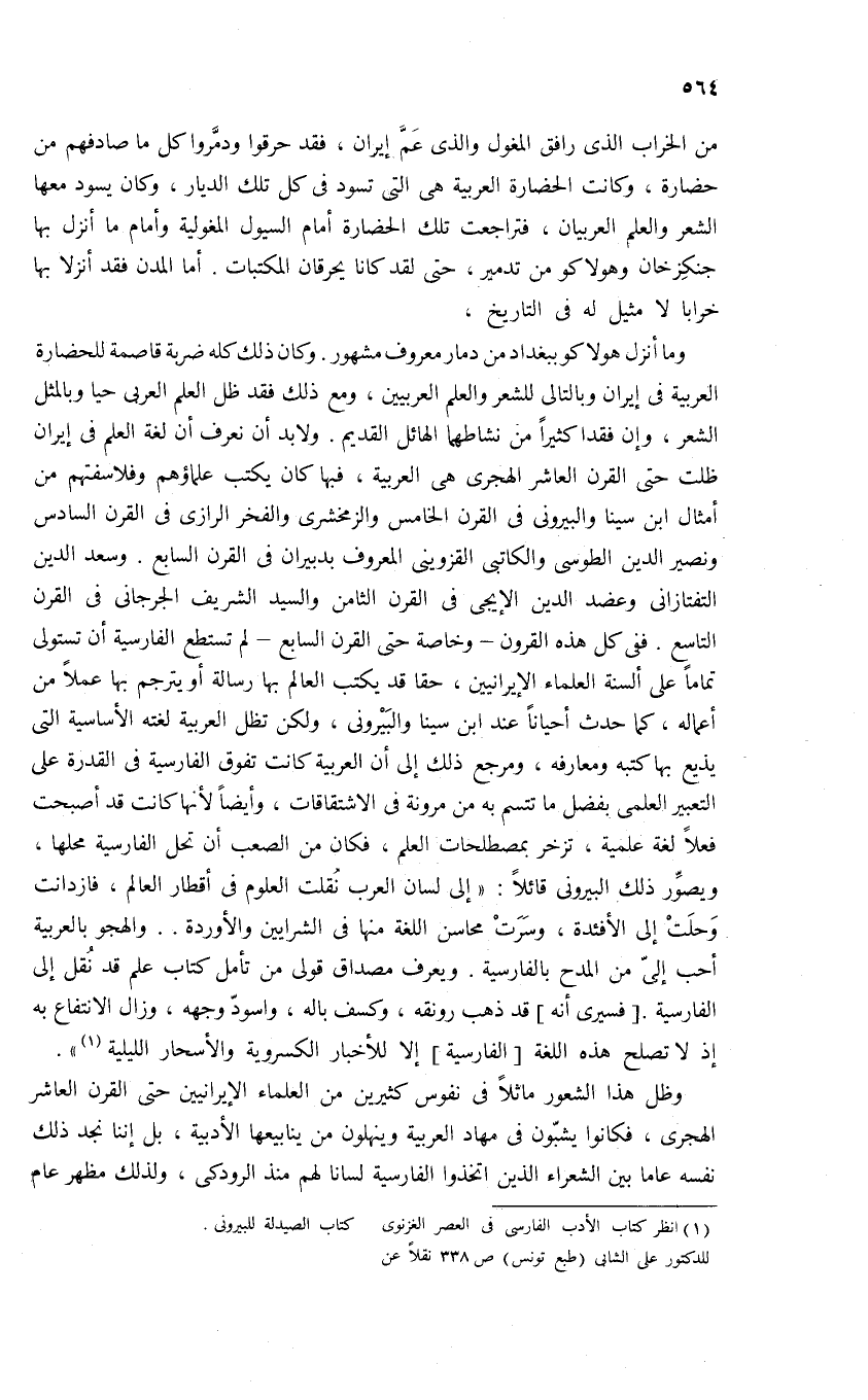 وما أنزل هولاكو ببغداد من دمار معروف مشهور. وكان ذلك كله ضربة قاصمة للحضارة العربية فى إيران وبالتالى للشعر والعلم العربيين، ومع ذلك فقد ظل العلم العربى حيا وبالمثل الشعر، وإن فقدا كثيرا من نشاطهما الهائل القديم. ولابد أن نعرف أن لغة العلم فى إيران ظلت حتى القرن العاشر الهجرى هى العربية، فبها كان يكتب علماؤهم وفلاسفتهم من أمثال ابن سينا والبيرونى فى القرن الخامس والزمخشرى والفخر الرازى فى القرن السادس ونصير الدين الطوسى والكاتبى القزوينى المعروف بدبيران فى القرن السابع. وسعد الدين التفتازانى وعضد الدين الإيجى فى القرن الثامن والسيد الشريف الجرجانى فى القرن التاسع. ففى كل هذه القرون-وخاصة حتى القرن السابع-لم تستطع الفارسية أن تستولى تماما على ألسنة العلماء الإيرانيين، حقا قد يكتب العالم بها رسالة أو يترجم بها عملا من أعماله، كما حدث أحيانا عند ابن سينا والبيرونى، ولكن تظل العربية لغته الأساسية التى يذيع بها كتبه ومعارفه، ومرجع ذلك إلى أن العربية كانت تفوق الفارسية فى القدرة على التعبير العلمى بفضل ما تتسم به من مرونة فى الاشتقاقات، وأيضا لأنها كانت قد أصبحت فعلا لغة علمية، تزخر بمصطلحات العلم، فكان من الصعب أن تحل الفارسية محلها، ويصوّر ذلك البيرونى قائلا: «إلى لسان العرب نقلت العلوم فى أقطار العالم، فازدانت وحلت إلى الأفئدة، وسرت محاسن اللغة منها فى الشرايين والأوردة. . والهجو بالعربية أحب إلىّ من المدح بالفارسية. ويعرف مصداق قولى من تأمل كتاب علم قد نقل إلى الفارسية. [فسيرى أنه] قد ذهب رونقه، وكسف باله، واسودّ وجهه، وزال الانتفاع به إذ لا تصلح هذه اللغة [الفارسية] إلا للأخبار الكسروية والأسحار الليلية (¬1)».
