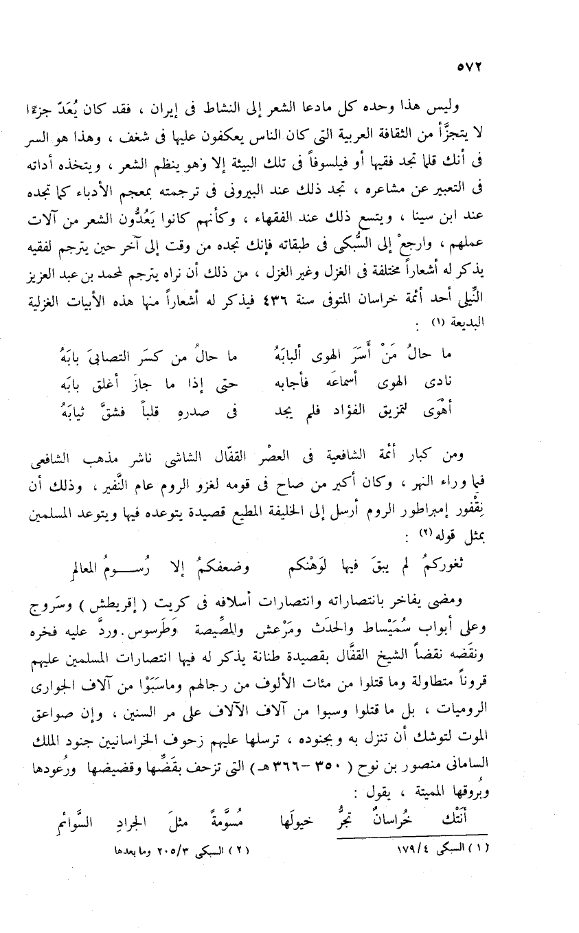 وليس هذا وحده كل ما دعا الشعر إلى النشاط فى إيران، فقد كان يعدّ جزءا لا يتجزّأ من الثقافة العربية التى كان الناس يعكفون عليها فى شغف، وهذا هو السر فى أنك قلما تجد فقيها أو فيلسوفا فى تلك البيئة إلا وهو ينظم الشعر، ويتخذه أداته فى التعبير عن مشاعره، تجد ذلك عند البيرونى فى ترجمته بمعجم الأدباء كما تجده عند ابن سينا، ويتسع ذلك عند الفقهاء، وكأنهم كانوا يعدّون الشعر من آلات عملهم، وارجع إلى السّبكى فى طبقاته فإنك تجده من وقت إلى آخر حين يترجم لفقيه يذكر له أشعارا مختلفة فى الغزل وغير الغزل، من ذلك أن نراه يترجم لمحمد بن عبد العزيز النّيلى أحد أئمة خراسان المتوفى سنة 436 فيذكر له أشعارا منها هذه الأبيات الغزلية البديعة (¬1):