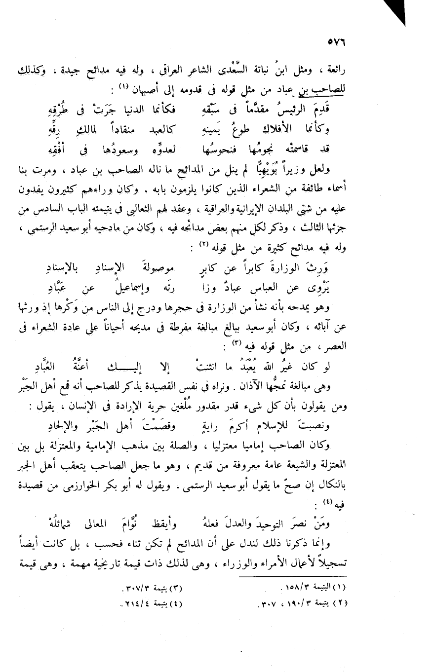 وهى مبالغة تمجّها الآذان. ونراه فى نفس القصيدة يذكر للصاحب أنه قمع أهل الجبر ومن يقولون بأن كل شئ قدر مقدور ملغين حرية الإرادة فى الإنسان، يقول: