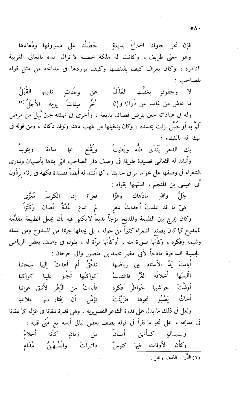 ولعل فى ذلك ما يدل على قدرة الشاعر التصويرية، وهى قدرة تلقانا فى غزله كما تلقانا فى مديحه، على نحو ما نقرأ فى قوله يصف بعض ليالى أنسه مع منى قلبه: