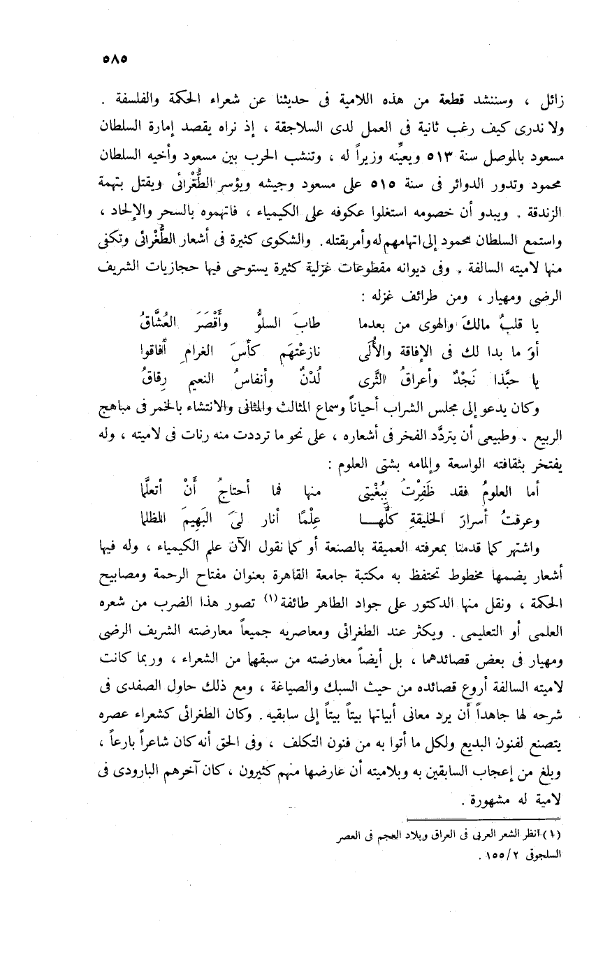 واشتهر كما قدمنا بمعرفته العميقة بالصنعة أو كما نقول الآن علم الكيمياء، وله فيها أشعار يضمها مخطوط تحتفظ به مكتبة جامعة القاهرة بعنوان مفتاح الرحمة ومصابيح الحكمة، ونقل منها الدكتور على جواد الطاهر طائفة (¬1) تصور هذا الضرب من شعره العلمى أو التعليمى. ويكثر عند الطغرائى ومعاصريه جميعا معارضته الشريف الرضى ومهيار فى بعض قصائدهما، بل أيضا معارضته من سبقهما من الشعراء، وربما كانت لاميته السالفة أروع قصائده من حيث السبك والصياغة، ومع ذلك حاول الصفدى فى شرحه لها جاهدا أن يرد معانى أبياتها بيتا بيتا إلى سابقيه. وكان الطغرائى كشعراء عصره يتصنع لفنون البديع ولكل ما أتوا به من فنون التكلف، وفى الحق أنه كان شاعرا بارعا، وبلغ من إعجاب السابقين به وبلاميته أن عارضها منهم كثيرون، كان آخرهم البارودى فى لامية له مشهورة.