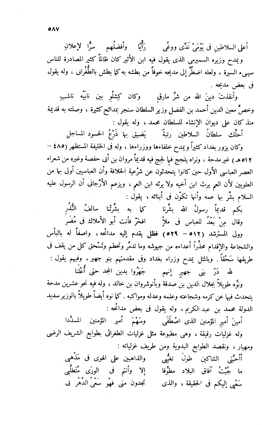 وولى المسترشد (512 - 529) فظل يقدم إليه مدائحه، واصفا له بالبأس والشجاعة والإقدام محذّرا أعداءه من جيوشه وما تدمّر وتحطم وتسحق كل من يقف فى طريقها سحقا. وبالمثل يمدح وزراء بغداد وفى مقدمتهم بنو جهير، وفيهم يقول: