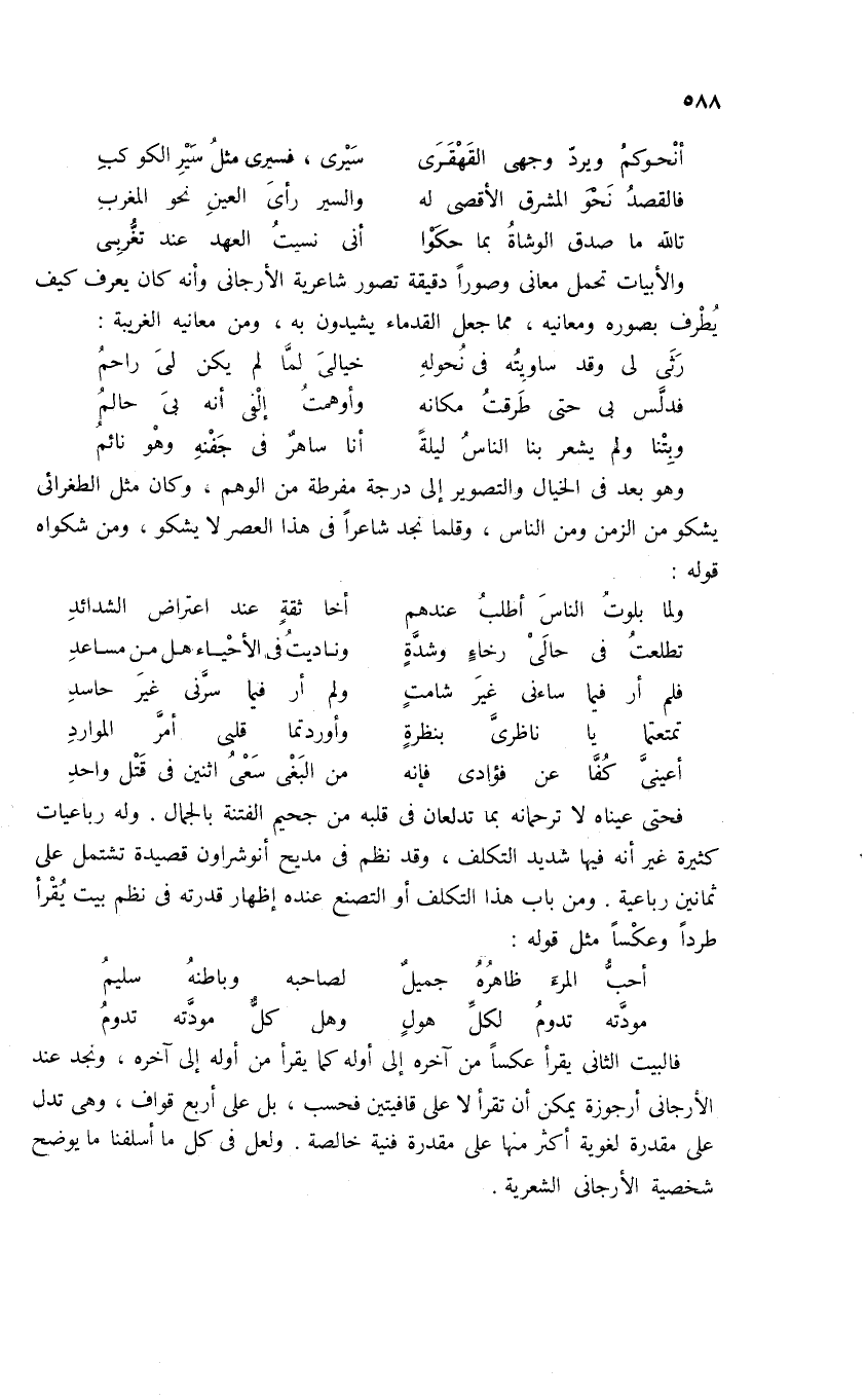 فالبيت الثانى يقرأ عكسا من آخره إلى أوله كما يقرأ من أوله إلى آخره، ونجد عند الأرجانى أرجوزة يمكن أن تقرأ لا على قافيتين فحسب، بل على أربع قواف، وهى تدل على مقدرة لغوية أكثر منها على مقدرة فنية خالصة. ولعل فى كل ما أسلفنا ما يوضح شخصية الأرجانى الشعرية.