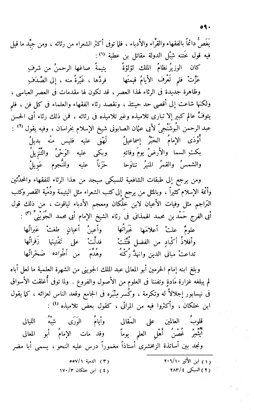 ومن يرجع إلى طبقات الشافعية للسبكى سيجد من هذا الرثاء للفقهاء والمحدّثين وأئمة الإسلام كثيرا، وبالمثل من يرجع إلى كتب الشعراء مثل اليتيمة ودمية القصر وكتب التراجم مثل وفيات الأعيان لابن خلّكان ومعجم الأدباء لياقوت، من ذلك قول أبى الفرج حمد بن محمد الهمذانى فى رثاء الشيخ الإمام أبى محمد الجوينىّ (¬3):