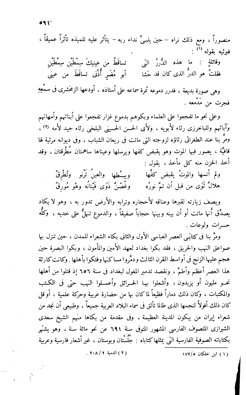 ومرّ بنا فى كتابى العصر العباسى الأول والثانى بكاء الشعراء للمدن، حين تنزل بها صواعق النهب والحريق، فقد بكوا بغداد لعهد الأمين والمأمون، وبكوا البصرة حين هجم عليها الزنج فى أواسط القرن الثالث ودمّروا مساكنها وفتكوا بأهلها. وكانت كارثة هذا العصر أعظم وأطمّ، ونقصد تدمير المغول لبغداد فى سنة 656 إذ قتلوا من أهلها نحو مليون أو يزيدون، وأشعلوا بها الحرائق وأعملوا النهب حتى فى الكتب والمكتبات، وكان ذلك دمارا فظيعا لما كان بها من حضارة عربية وحركة علمية، أو قل كان ذلك أفولا لنجمها الذى طالما تألق فى سماء البلاد العربية جميعا، وطبيعى أن نجد من شعراء إيران من يبكون المدينة العظيمة، وفى مقدمة من بكاها منهم الشيخ سعدى الشيرازى المتصوف الفارسى المشهور المتوفى سنة 691 عن نحو مائة سنة، وهو يشتهر بكتاباته الصوفية الفارسية التى يمثلها كتاباه: جلستان وبوستان، غير أشعار فارسية وعربية