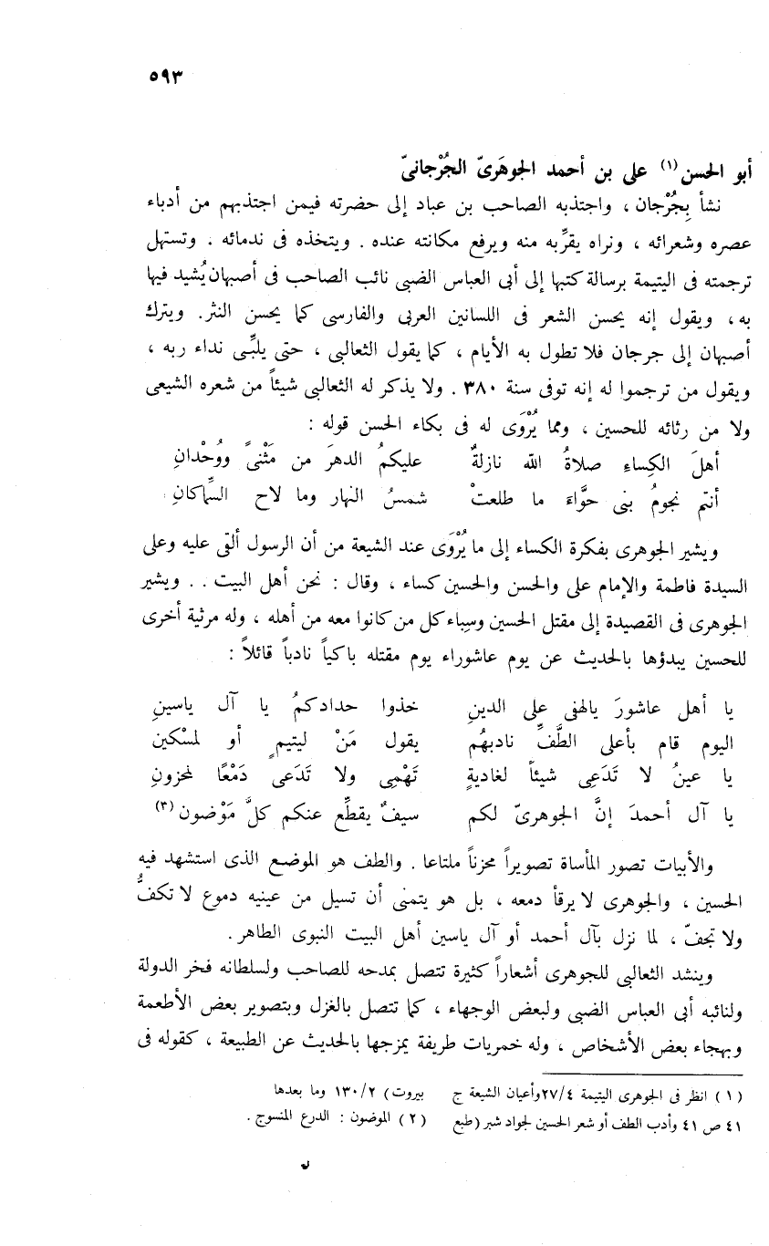 (¬1) انظر فى الجوهرى اليتيمة 4/ 27 وأعيان الشيعة ج 41 ص 41 وأدب الطف أو شعر الحسين لجواد شبر (طبع بيروت) 2/ 130 وما بعدها