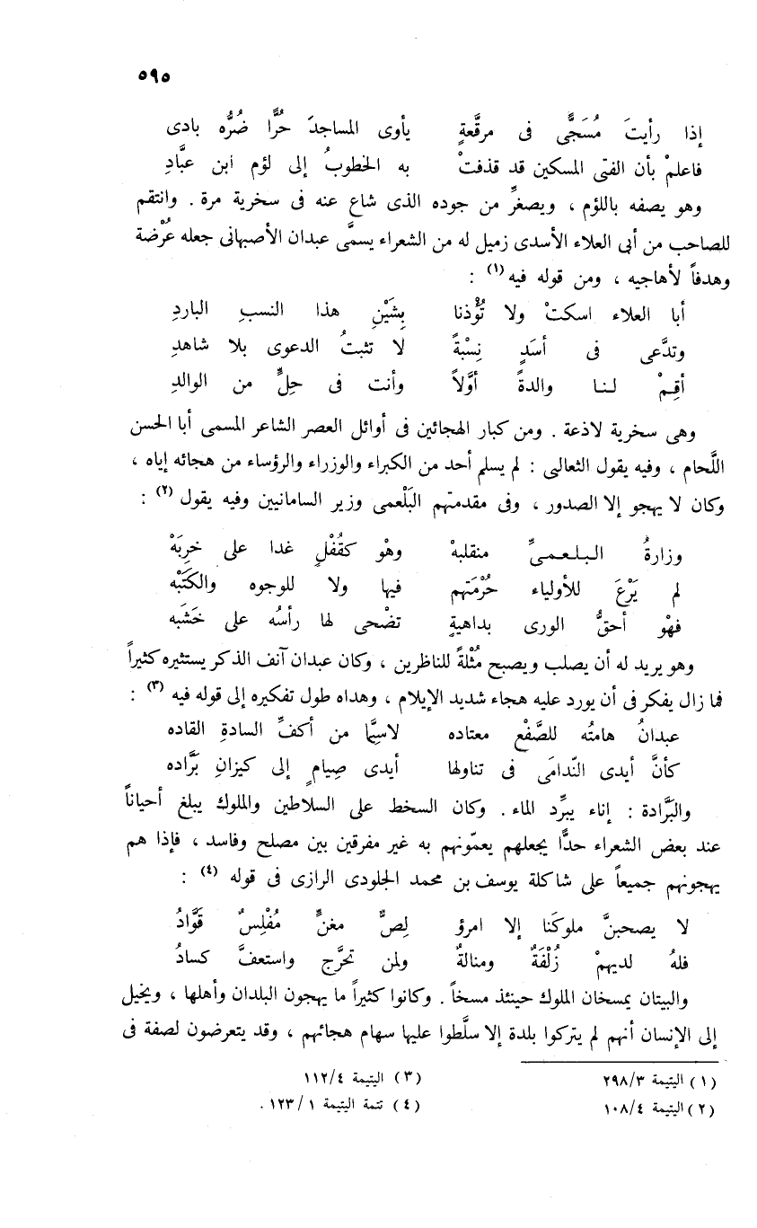 وهى سخرية لاذعة. ومن كبار الهجائين فى أوائل العصر الشاعر المسمى أبا الحسن اللّحام، وفيه يقول الثعالبى: لم يسلم أحد من الكبراء والوزراء والرؤساء من هجائه إياه، وكان لا يهجو إلا الصدور، وفى مقدمتهم البلعمى وزير السامانيين وفيه يقول (¬2):