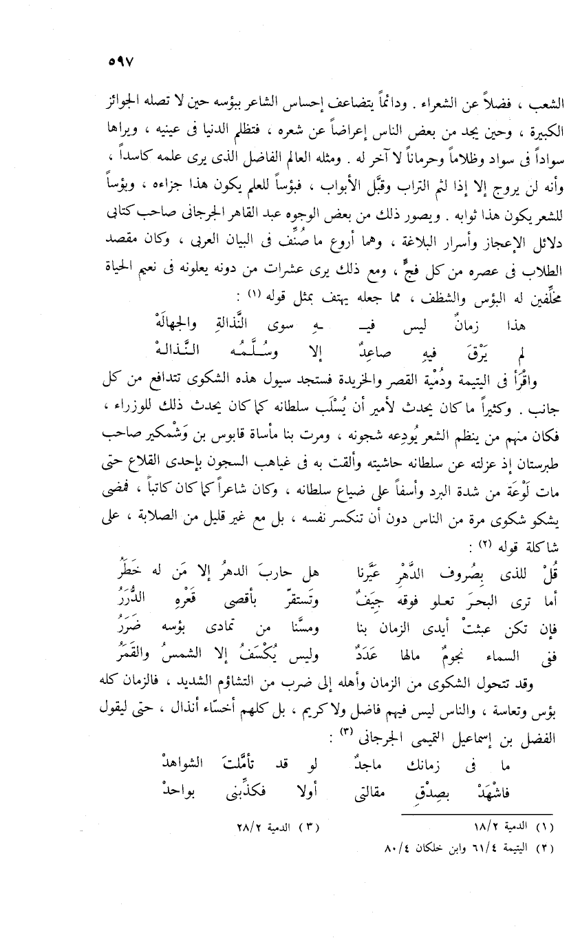 الشعب، فضلا عن الشعراء. ودائما يتضاعف إحساس الشاعر ببؤسه حين لا تصله الجوائز الكبيرة، وحين يجد من بعض الناس إعراضا عن شعره، فتظلم الدنيا فى عينيه، ويراها سوادا فى سواد وظلاما وحرمانا لا آخر له. ومثله العالم الفاضل الذى يرى علمه كاسدا، وأنه لن يروج إلا إذا لثم التراب وقبّل الأبواب، فبؤسا للعلم يكون هذا جزاءه، وبؤسا للشعر يكون هذا ثوابه. ويصور ذلك من بعض الوجوه عبد القاهر الجرجانى صاحب كتابى دلائل الإعجاز وأسرار البلاغة، وهما أروع ما صنّف فى البيان العربى، وكان مقصد الطلاب فى عصره من كل فجّ، ومع ذلك يرى عشرات من دونه يعلونه فى نعيم الحياة مخلّفين له البؤس والشظف، مما جعله يهتف بمثل قوله (¬1):