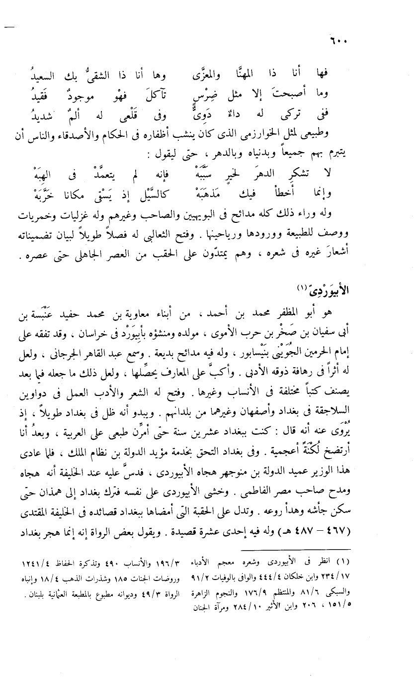 (¬1) انظر فى الأبيوردى وشعره معجم الأدباء 17/ 234 وابن خلكان 4/ 444 والوافى بالوفيات 2/ 91 والسبكى 6/ 81 والمنتظم 9/ 176 والنجوم الزاهرة 5/ 151، 206 وابن الأثير 10/ 284 ومرآة الجنان 3/ 196 والأنساب 490 وتذكرة الحفاظ 4/ 1241 وروضات الجنات 185 وشذرات الذهب 4/ 18 وإنباه الرواة 3/ 49 وديوانه مطبوع بالمطبعة العثمانية بلبنان.