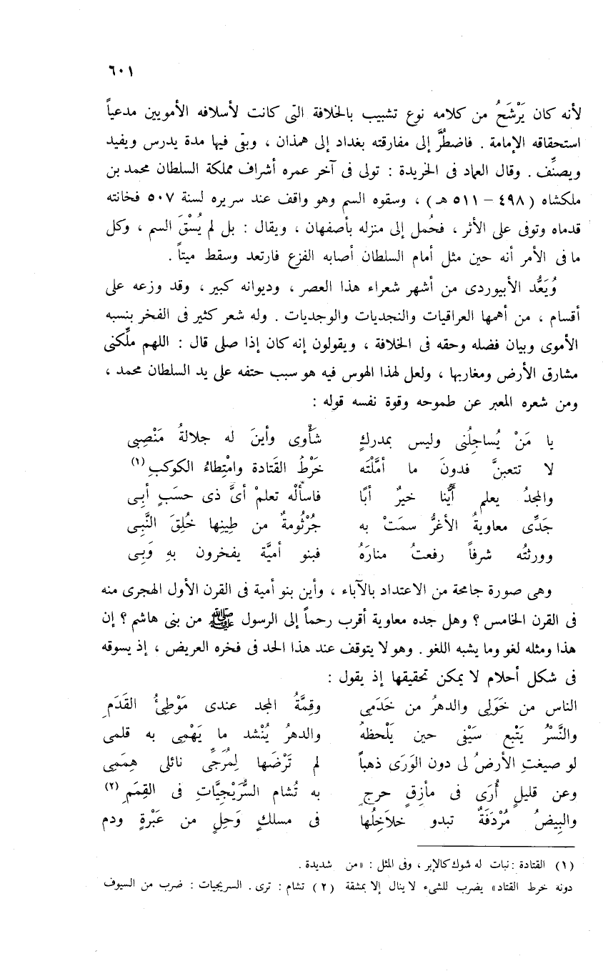 وهى صورة جامحة من الاعتداد بالآباء، وأين بنو أمية فى القرن الأول الهجرى منه فى القرن الخامس؟ وهل جده معاوية أقرب رحما إلى الرسول صلى الله عليه وسلم من بنى هاشم؟ إن هذا ومثله لغو وما يشبه اللغو. وهو لا يتوقف عند هذا الحد فى فخره العريض، إذ يسوقه فى شكل أحلام لا يمكن تحقيقها إذ يقول:
