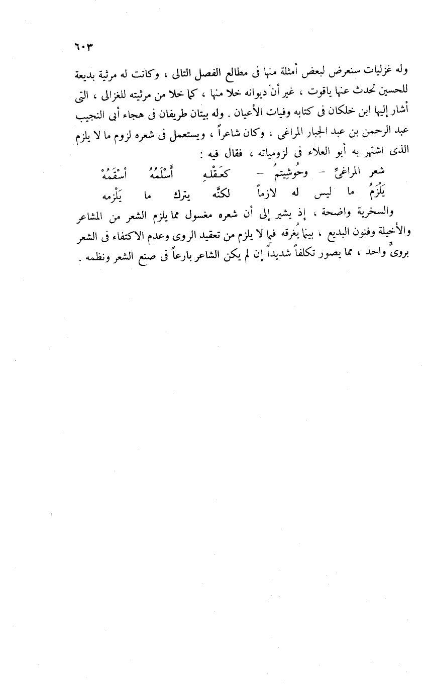 وله غزليات سنعرض لبعض أمثلة منها فى مطالع الفصل التالى، وكانت له مرثية بديعة للحسين تحدث عنها ياقوت، غير أن ديوانه خلا منها، كما خلا من مرثيته للغزالى، التى أشار إليها ابن خلكان فى كتابه وفيات الأعيان. وله بيتان طريفان فى هجاء أبى النجيب عبد الرحمن بن عبد الجبار المراغى، وكان شاعرا، ويستعمل فى شعره لزوم ما لا يلزم الذى اشتهر به أبو العلاء فى لزومياته، فقال فيه: