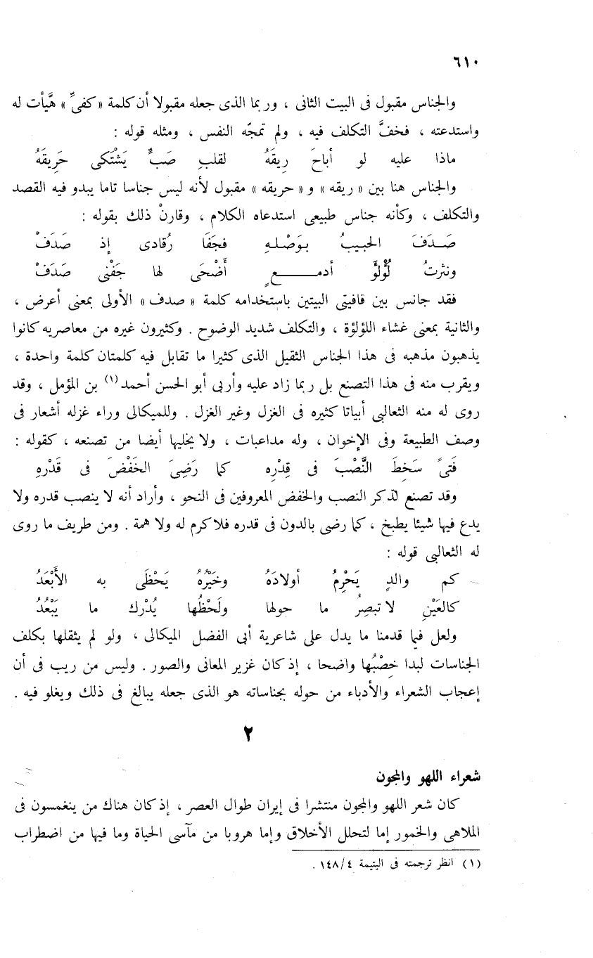 فقد جانس بين قافيتى البيتين باستخدامه كلمة «صدف» الأولى بمعنى أعرض، والثانية بمعنى غشاء اللؤلؤة، والتكلف شديد الوضوح. وكثيرون غيره من معاصريه كانوا يذهبون مذهبه فى هذا الجناس الثقيل الذى كثيرا ما تقابل فيه كلمتان كلمة واحدة، ويقرب منه فى هذا التصنع بل ربما زاد عليه وأربى أبو الحسن أحمد (¬1) بن المؤمل، وقد روى له منه الثعالبى أبياتا كثيرة فى الغزل وغير الغزل. وللميكالى وراء غزله أشعار فى وصف الطبيعة وفى الإخوان، وله مداعبات، ولا يخليها أيضا من تصنعه، كقوله: