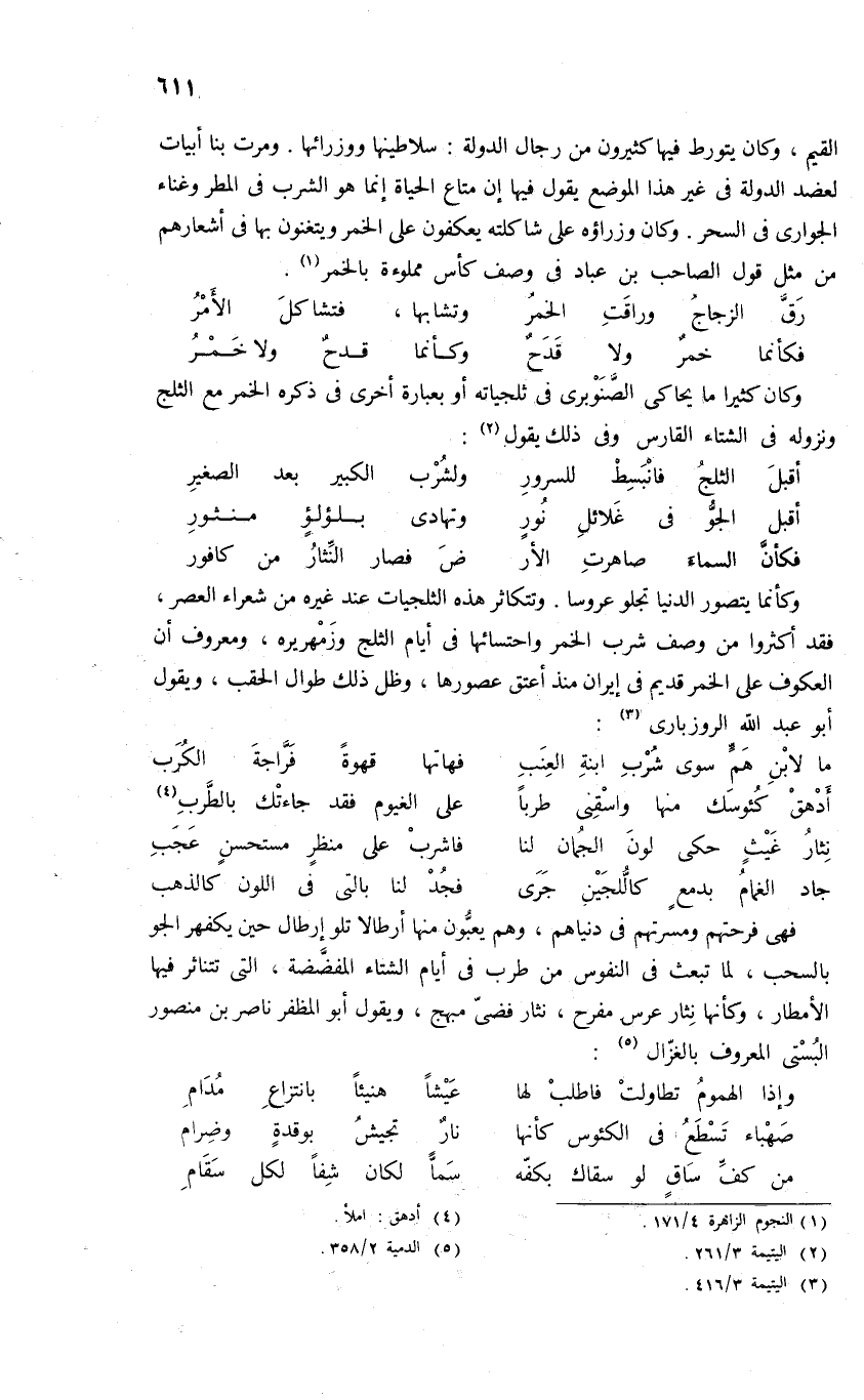 وكأنما يتصور الدنيا تجلو عروسا. وتتكاثر هذه الثلجيات عند غيره من شعراء العصر، فقد أكثروا من وصف شرب الخمر واحتسائها فى أيام الثلج وزمهريره، ومعروف أن العكوف على الخمر قديم فى إيران منذ أعتق عصورها، وظل ذلك طوال الحقب، ويقول أبو عبد الله الروزبارى (¬3):