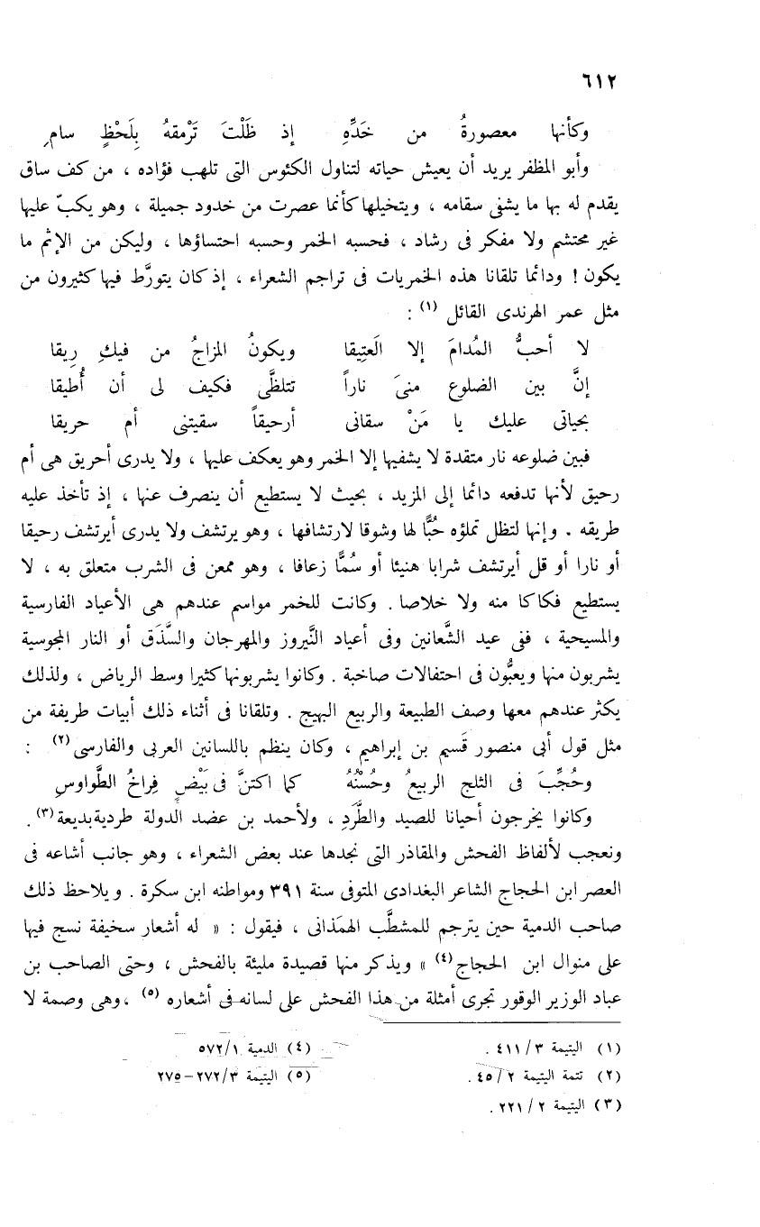 وأبو المظفر يريد أن يعيش حياته لتناول الكئوس التى تلهب فؤاده، من كف ساق يقدم له بها ما يشفى سقامه، ويتخيلها كأنما عصرت من خدود جميلة، وهو يكبّ عليها غير محتشم ولا مفكر فى رشاد، فحسبه الخمر وحسبه احتساؤها، وليكن من الإثم ما يكون! ودائما تلقانا هذه الخمريات فى تراجم الشعراء، إذ كان يتورّط فيها كثيرون من مثل عمر الهرندى القائل (¬1):