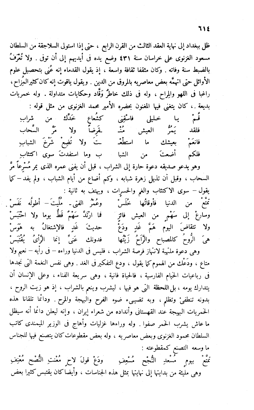 وهى دعوة ملتهبة لانتهاز فرصة الشراب، فليس فى الدنيا وراءه-فى رأيه-نعيم ولا متاع، ودعك من الهموم كما يقول، ودع التفكير فى الغد. وهى نفس النغمة التى نجدها فى رباعيات الخيام الفارسية، فالحياة فانية، وهى سريعة الفناء، وعلى الإنسان أن يتدارك يومه، بل اللحظة التى هو فيها، ليشرب وينعم بالشراب، إذ هو زيت الروح، بدونه تنطفئ وتظلم، وبه تضيئ ضوء الفرح والبهجة والمرح. ودائما تلقانا هذه الخمريات البهيجة عند القهستانى وأنداده من شعراء إيران، وإنه ليعلن دائما أنه سيظل ما عاش يشرب الخمر صفوا. وله وراءها غزليات وأهاج فى الوزير الميمندى كاتب السلطان محمود الغزنوى وبعض معاصريه، وله بعض مقطوعات كان يتصنع فيها للجناس ما وسعه التصنع كمقطوعته: