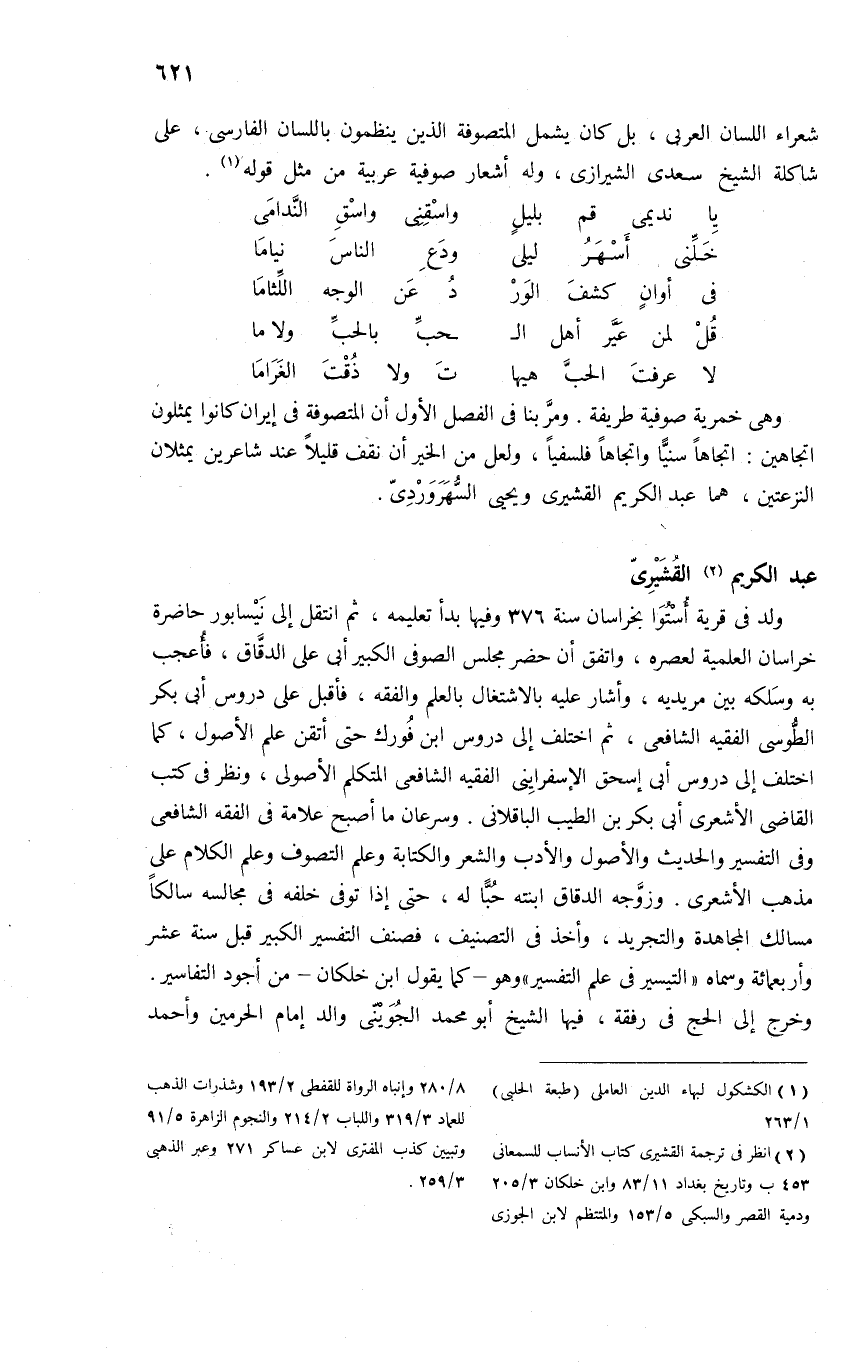وهى خمرية صوفية طريفة. ومرّ بنا فى الفصل الأول أن المتصوفة فى إيران كانوا يمثلون اتجاهين: اتجاها سنيّا واتجاها فلسفيا، ولعل من الخير أن نقف قليلا عند شاعرين يمثلان النزعتين، هما عبد الكريم القشيرى ويحيى السّهروردىّ.