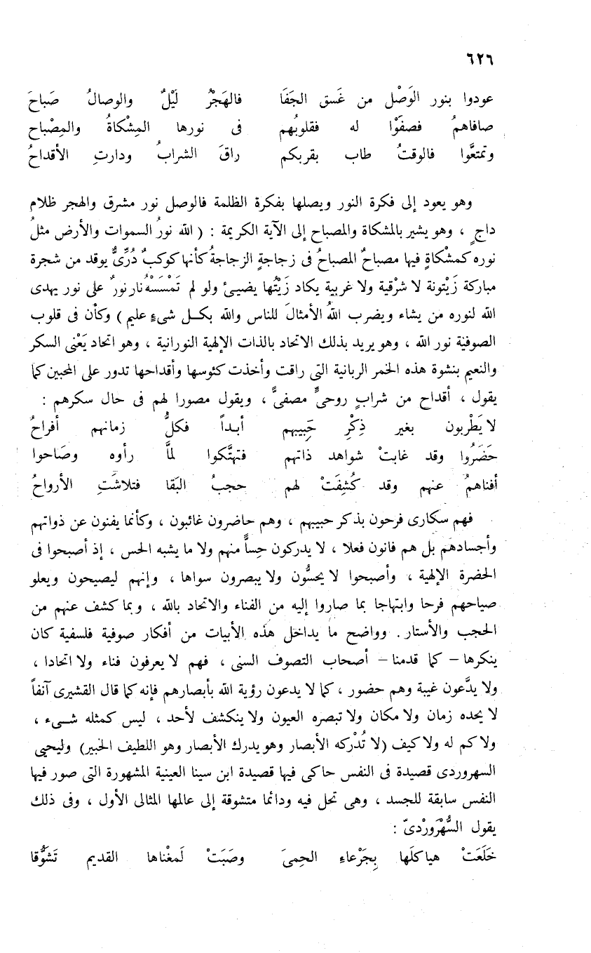 وهو يعود إلى فكرة النور ويصلها بفكرة الظلمة فالوصل نور مشرق والهجر ظلام داج، وهو يشير بالمشكاة والمصباح إلى الآية الكريمة: (الله نور السموات والأرض مثل نوره كمشكاة فيها مصباح المصباح فى زجاجة الزجاجة كأنها كوكب درّىّ يوقد من شجرة مباركة زيتونة لا شرقية ولا غربية يكاد زيتها يضيئ ولو لم تمسسه نار نور على نور يهدى الله لنوره من يشاء ويضرب الله الأمثال للناس والله بكل شئ عليم) وكأن فى قلوب الصوفية نور الله، وهو يريد بذلك الاتحاد بالذات الإلهية النورانية، وهو اتحاد يعنى السكر والنعيم بنشوة هذه الخمر الربانية التى راقت وأخذت كئوسها وأقداحها تدور على المحبين كما يقول، أقداح من شراب روحىّ مصفىّ، ويقول مصورا لهم فى حال سكرهم: