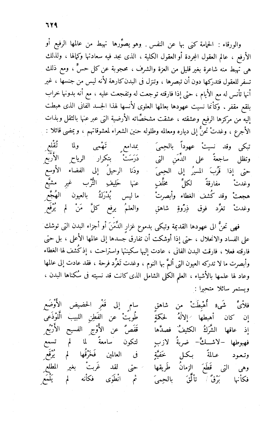 والورقاء: الحمامة كنى بها عن النفس. وهو يصوّرها تهبط من عالمها الرفيع أو الأرفع، عالم العقول المجردة أو العقول الكلية، الذى نجد فيه سعادتها وكمالها، ولذلك هى تهبط منه شاعرة بغير قليل من العزة والشرف، محجوبة عن كل حسّ، ومع ذلك تسفر للعقول فتدركها دون أن تبصرها، وتنزل فى البدن كارهة لأنه ليس من جنسها، غير أنها تأنس له مع الأيام، حتى إذا فارقته توجعت له وتفجعت عليه، مع أنه بدونها خراب بلقع مقفر. وكأنما نسيت عهودها بعالمها العلوى لأنسها لهذا الجسد الفانى الذى هبطت إليه من مركزها الرفيع وعشقته، عشقت مشخصّاته الأرضية التى عبر عنها بالثقل وبذات الأجرع، وغدت تحنّ إلى دياره ومعالمه وطلوله حنين الشعراء لمعشوقاتهم، ويمضى قائلا: