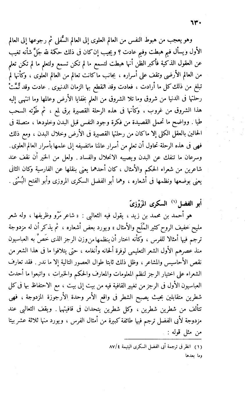 وسرعان ما تنفك عن البدن ويصيبه الانحلال والفساد. ولعل من الخير أن نقف عند شاعرين من شعراء الحكم والأمثال، كان أحدهما يعنى بنقلها عن الفارسية وكان الثانى يعنى بوضعها ونظمها فى أشعاره، وهما أبو الفضل السكرى المروزى وأبو الفتح البستى.