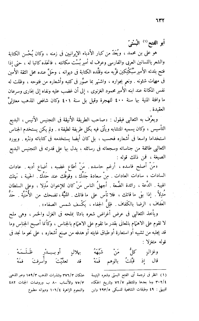 (¬1) انظر فى ترجمة أبى الفتح البستى وشعره اليتيمة 4/ 302 وما بعدها والمنتظم 7/ 27 وتاريخ الحكماء للبيهقى: 49 وطبقات الشافعية للسبكى 5/ 293 وابن خلكان 3/ 376 وشذرات الذهب 3/ 159 وعبر الذهبى 3/ 75 والأنساب 80 ب وروضات الجنات 482 والنجوم الزاهرة 4/ 106 وديوانه مطبوع