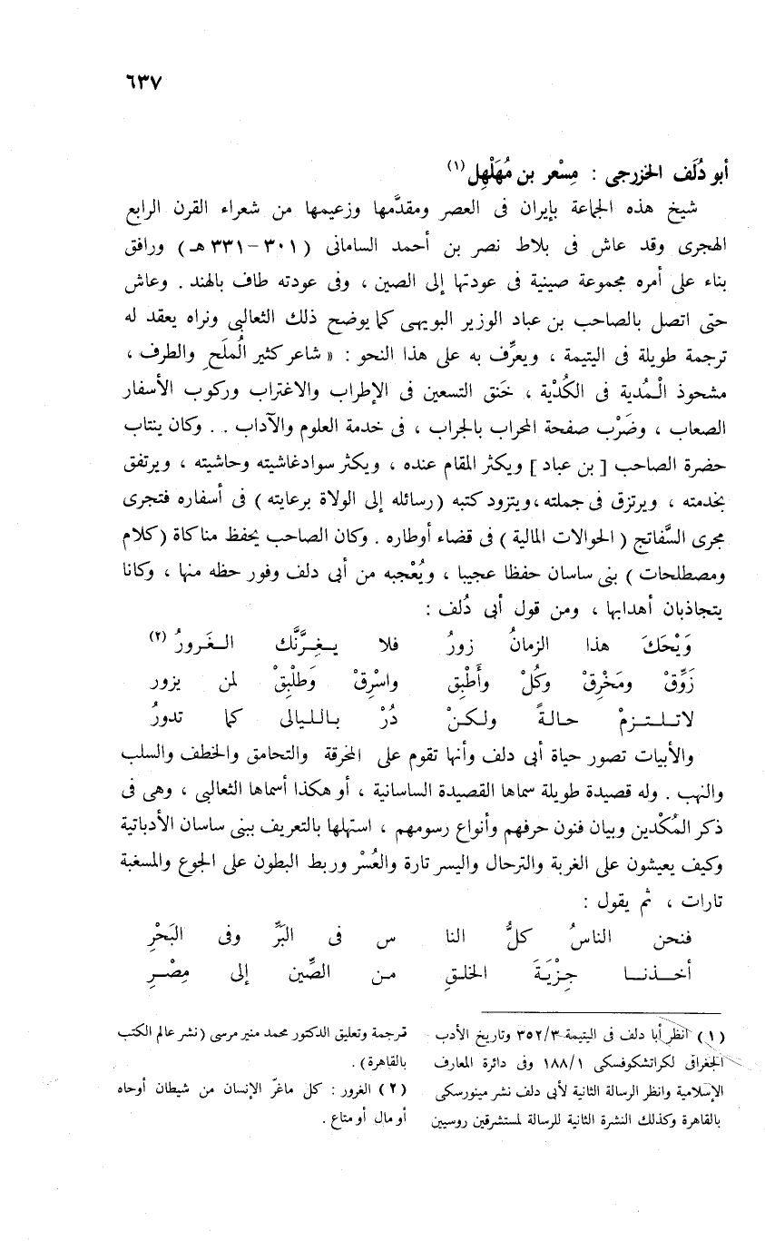 (¬1) انظر أبا دلف فى اليتيمة 3/ 352 وتاريخ الأدب الجغرافى لكراتشكوفسكى 1/ 188 وفى دائرة المعارف الإسلامية وانظر الرسالة الثانية لأبى دلف نشر مينورسكى بالقاهرة وكذلك النشرة الثانية للرسالة لمستشرقين روسيين ترجمة وتعليق الدكتور محمد منير مرسى (نشر عالم الكتب بالقاهرة).