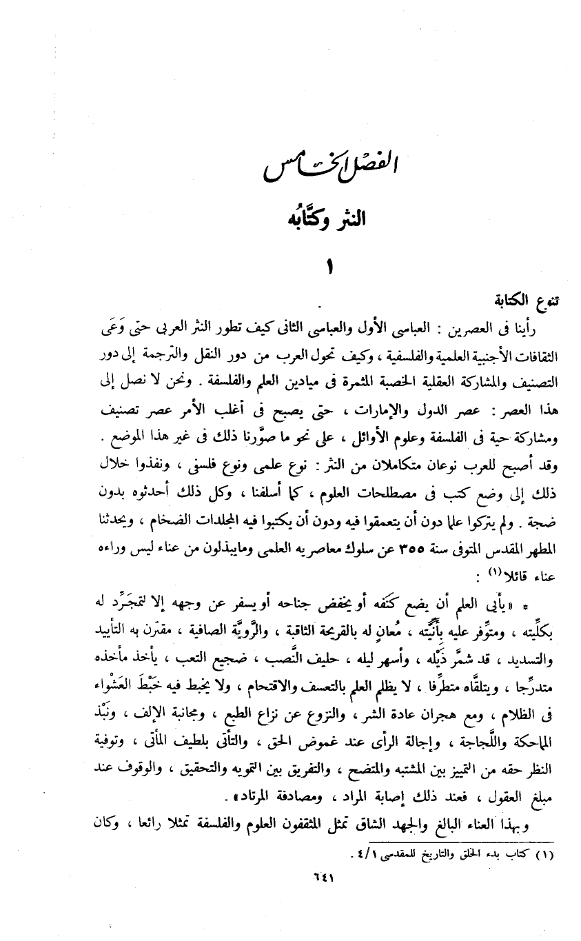 رأينا فى العصرين: العباسى الأول والعباسى الثانى كيف تطور النثر العربى حتى وعى الثقافات الأجنبية العلمية والفلسفية، وكيف تحول العرب من دور النقل والترجمة إلى دور التصنيف والمشاركة العقلية الخصبة المثمرة فى ميادين العلم والفلسفة. ونحن لا نصل إلى هذا العصر: عصر الدول والإمارات، حتى يصبح فى أغلب الأمر عصر تصنيف ومشاركة حية فى الفلسفة وعلوم الأوائل، على نحو ما صوّرنا ذلك فى غير هذا الموضع.