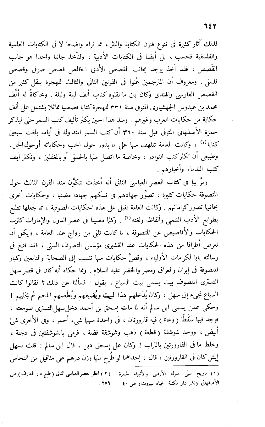 لذلك آثار كثيرة فى تنوع فنون الكتابة والنثر، مما نراه واضحا لا فى الكتابات العلمية والفلسفية فحسب، بل أيضا فى الكتابات الأدبية، ولنأخذ جانبا واحدا هو جانب القصص، فقد أخذ يوجد بجانب القصص الأدبى الخالص قصص صوفى وقصص فلسفى. ومعروف أن المترجمين عنوا فى القرنين الثانى والثالث للهجرة بنقل كثير من القصص الفارسى والهندى وكان بين ما نقلوه كتاب ألف ليلة وليلة. ومحاكاة له ألّف محمد بن عبدوس الجهشيارى المتوفى سنة 331 للهجرة كتابا قصصيا مماثلا يشتمل على ألف حكاية من حكايات العرب وغيرهم. ومنذ هذا الحين يكثر تأليف كتب السمر حتى ليذكر حمزة الأصفهانى المتوفى قبل سنة 360 أن كتب السمر المتداولة فى أيامه بلغت سبعين كتابا (¬1)، وكانت العامة تتلهف منها على ما يدور حول الحب وحكاياته أو حول الجن.