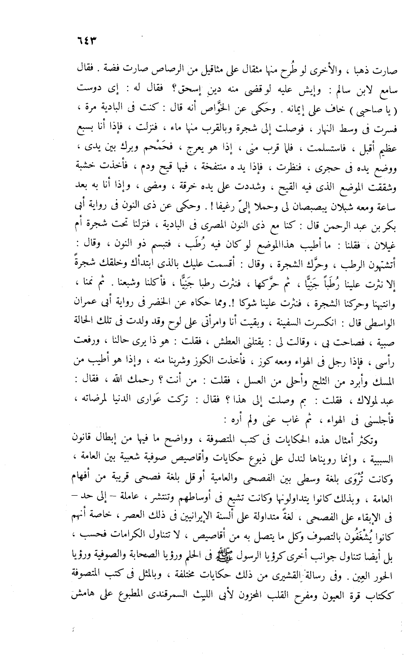 وتكثر أمثال هذه الحكايات فى كتب المتصوفة، وواضح ما فيها من إبطال قانون السببية، وإنما رويناها لندل على ذيوع حكايات وأقاصيص صوفية شعبية بين العامة، وكانت تروى بلغة وسطى بين الفصحى والعامية أو قل بلغة فصحى قريبة من أفهام العامة، وبذلك كانوا يتداولونها وكانت تشيع فى أوساطهم وتنتشر، عاملة-إلى حد- فى الإبقاء على الفصحى، لغة متداولة على ألسنة الإيرانيين فى ذلك العصر، خاصة أنهم كانوا يشغفون بالتصوف وكل ما يتصل به من أقاصيص، لا تتناول الكرامات فحسب، بل أيضا تتناول جوانب أخرى كرؤيا الرسول صلى الله عليه وسلم فى الحلم ورؤيا الصحابة والصوفية ورؤيا الحور العين. وفى رسالة القشيرى من ذلك حكايات مختلفة، وبالمثل فى كتب المتصوفة ككتاب قرة العيون ومفرح القلب المحزون لأبى الليث السمرقندى المطبوع على هامش